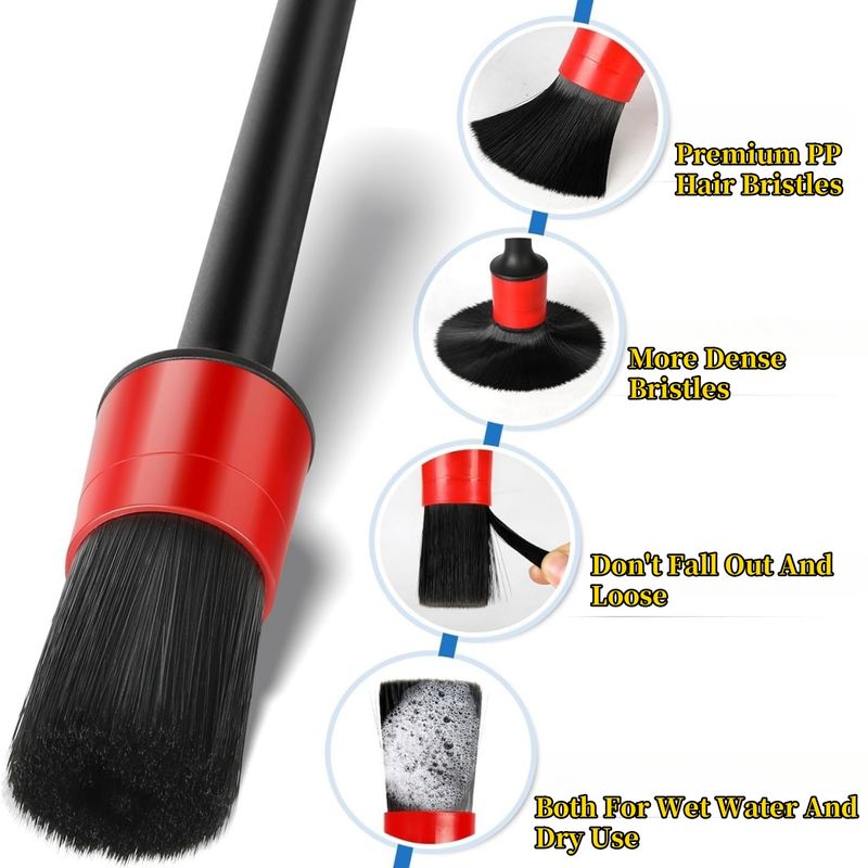 ADVANCED PACK: Build for ultimate control in tight, hard to reach areas. 1X angled wheel brush, easy scrubbing brake dust and road grime from your wheels both surface and behind wheel spokes. 1X wheel barrel brush, get the deep down of your barrels and offer effectively cleans.5X detailing brush help you handle the rest of tiny areas