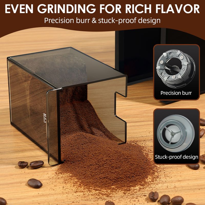 28 major settings with micro-adjustment for perfect fine to coarse grinding. Grinds coffee beans for espresso, cold brew, French press and much more. Elevate your daily coffee journey with our burr coffee grinder. With 28 precise grind settings, it dffortlessly transforms beans into aromatic excellence.Relish each sip and enrich your mornings,one cup at a time.Don not miss out-experence a new level of coffee enjoyment now.
