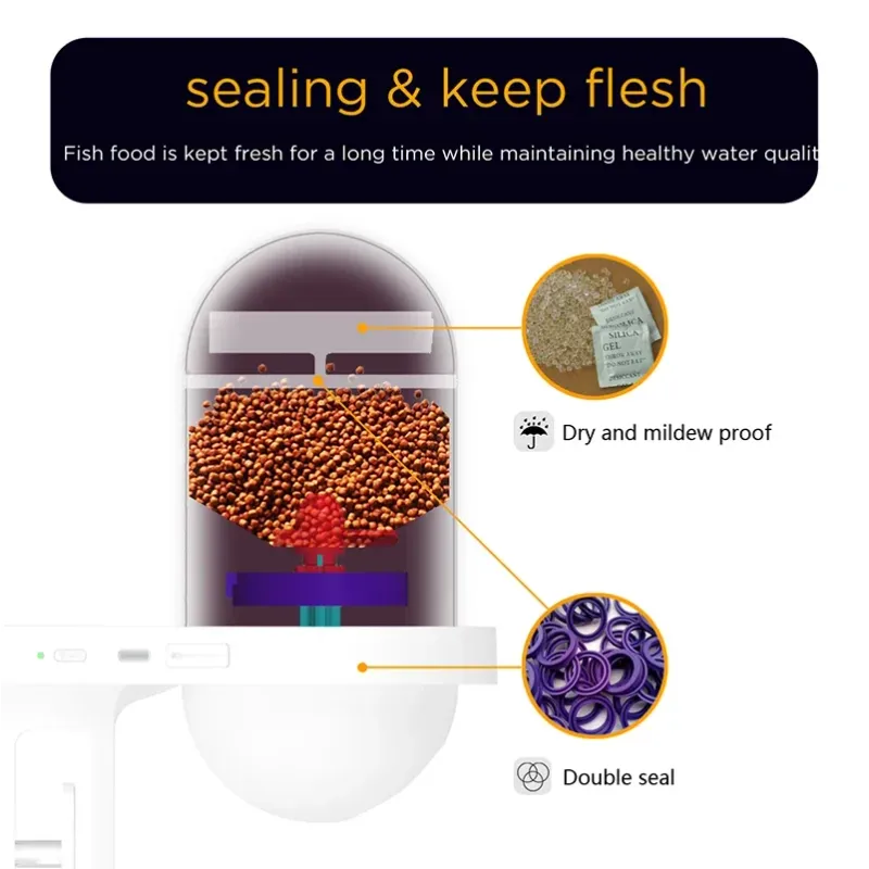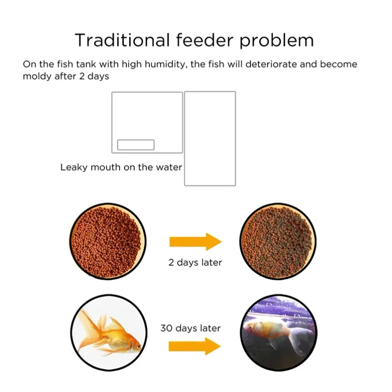 5.Misuse of fish food or other items outside the scope of this product, resulting in food jam After removing the food container, unscrew the lid of the distribution tank, take out thestuck items and reinstall them for use.