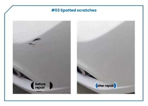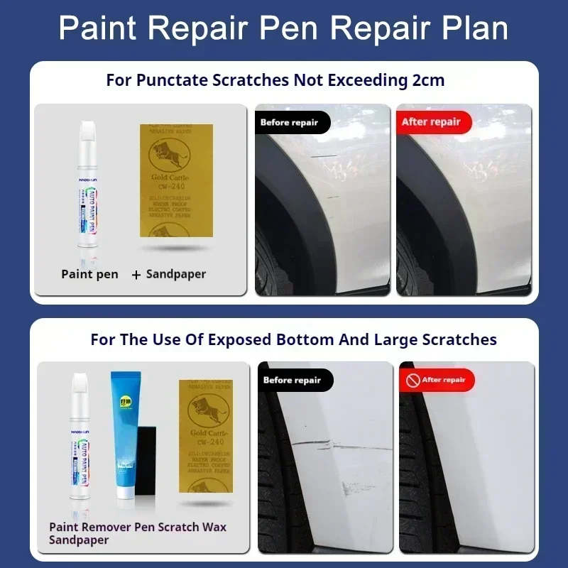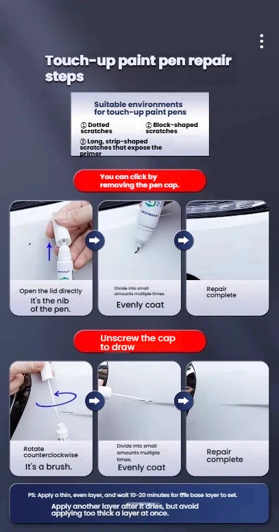 When used alone, the touch-up pen can be used to cover the spot paint peeling off, as well as to prevent rust and conceal the car paint in inconspicuous places. Use sandpaper with water to remove stains from painted surfaces and allow them to dry before touch-ups. After shaking the touch-up pen, use a brush dipped in a touch-up liquid to brush on the flawed position. If it is not completely covered by one operation, wait for the first layer of paint to dry and then apply the second layer until the defect is completely covered, and wait for all the paint to dry on the defect. Lightly smooth with sandpaper and water.