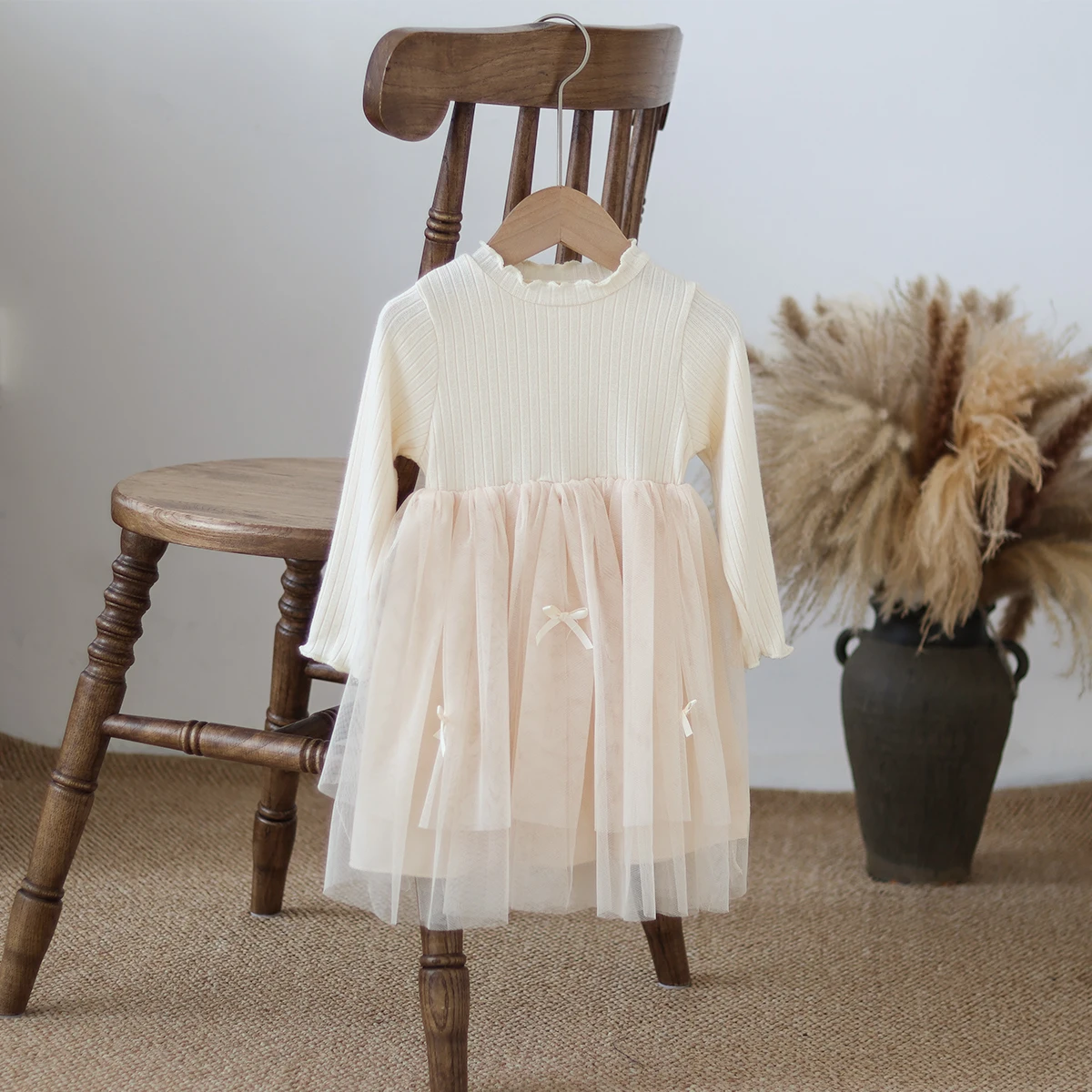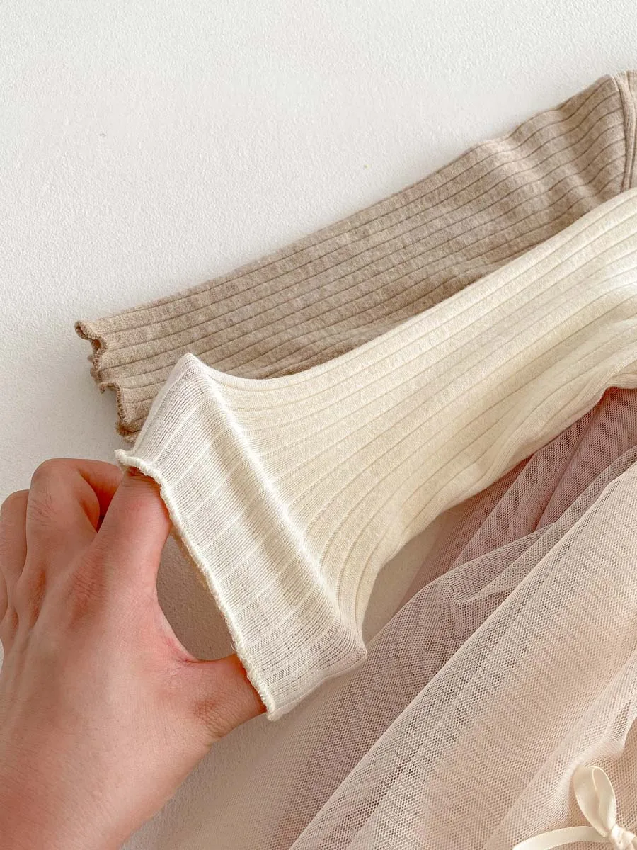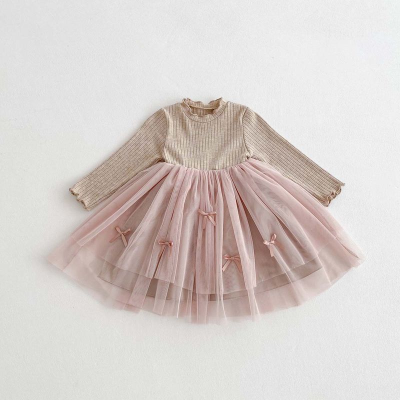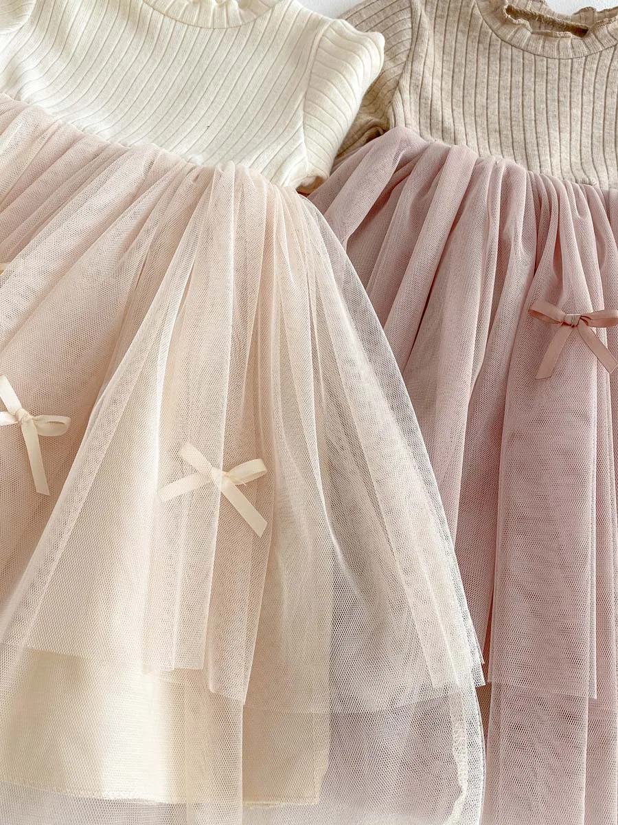 Autumn and Winter Fashion Toddler Girls Long Sleeve Mesh dress Pit Strip Ear Edge Bow Mesh Autumn and Winter dress Princess Gift