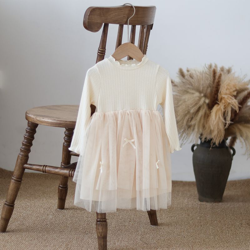 Autumn and Winter Fashion Toddler Girls Long Sleeve Mesh dress Pit Strip Ear Edge Bow Mesh Autumn and Winter dress Princess Gift