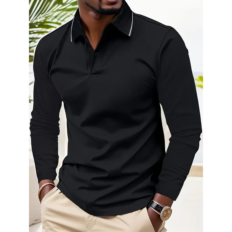 Autumn Men's Lapel Golf Casual Sports Contrast Color Long Sleeves Top Black 2XL