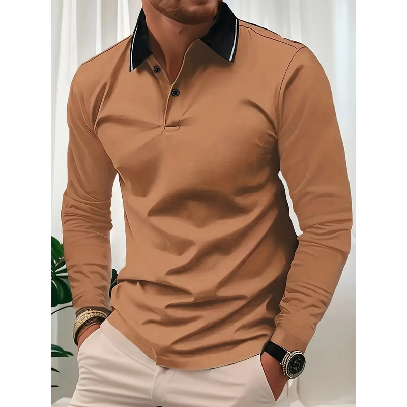 Autumn Men's Lapel Golf Casual Sports Contrast Color Long Sleeves Top Brown 3XL