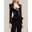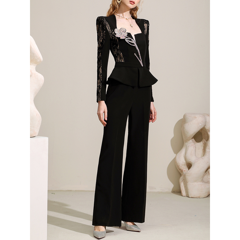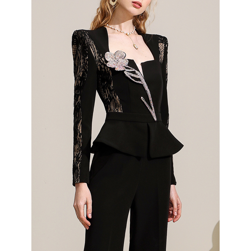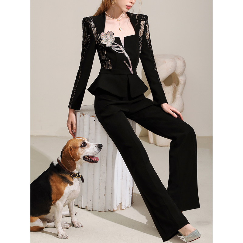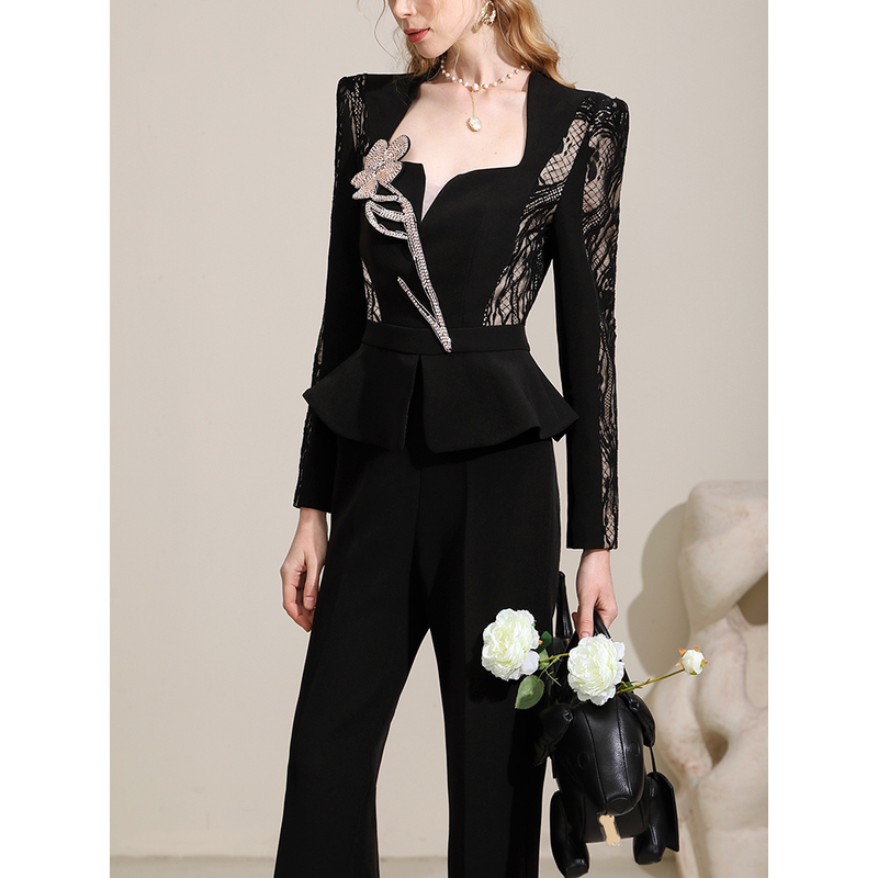 Autumn New Black Light Mature Royal Sister Style Personalized and Unique Lace Splice High Waist Set for Women