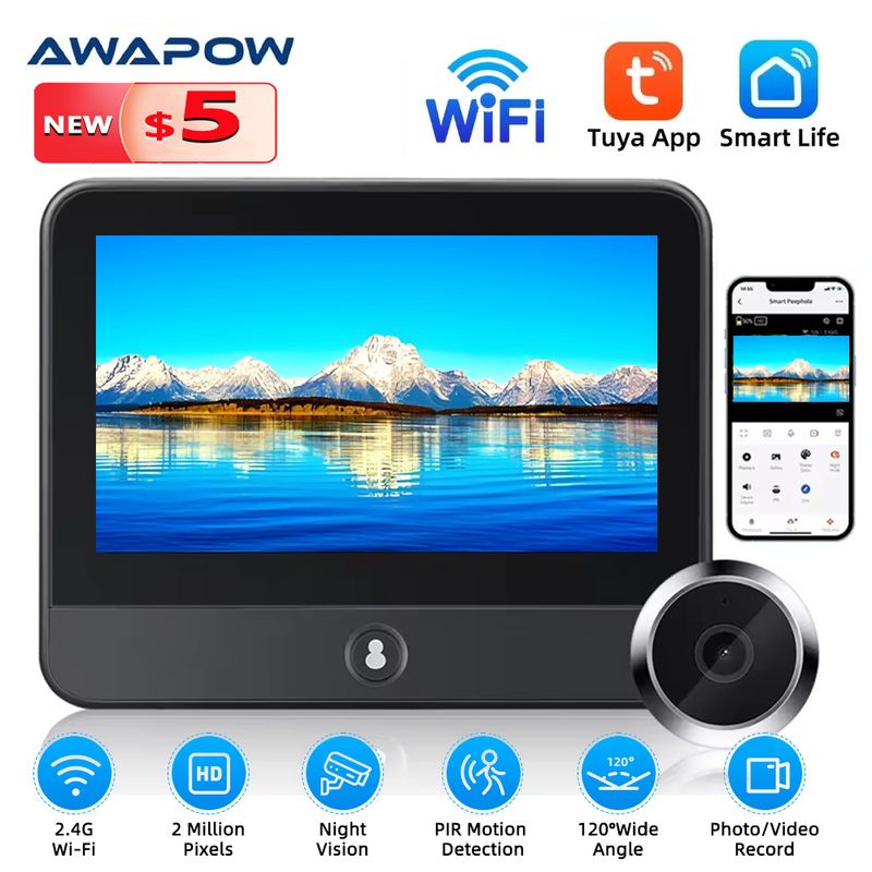 Awapow 1080P Tuya Peephole Doorbell Camera IR Night Vision Door Eye Camera 2.4G WiFi Door Bell Eye Peephole for Home Security