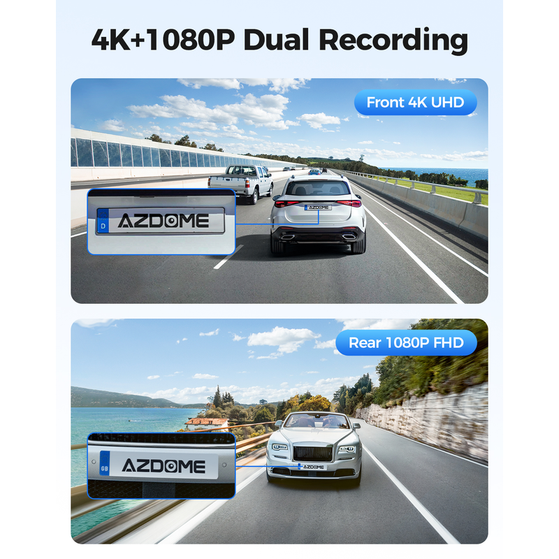 Captures ultra-high-definition video with 4K (3840x2160P) front and FHD 1080P rear resolution, ensuring clear details like license plates and road signs.