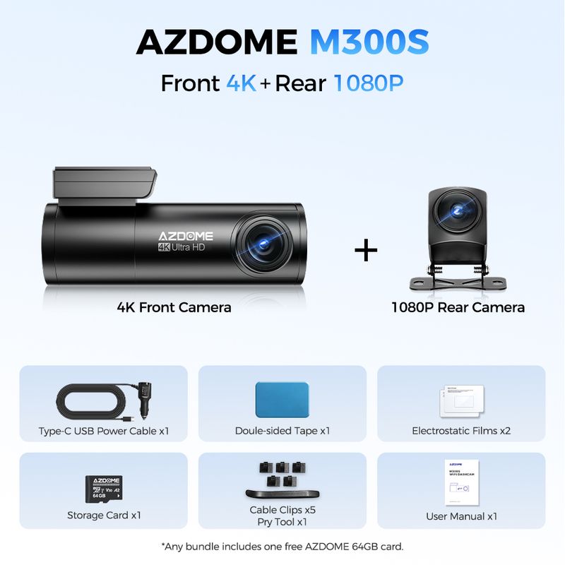 AZDOME M300S 4K Dash Cam Front and Rear, Built-in WiFi GPS Dash Camera for Cars, Free 64GB SD Card, Voice Control, WDR Night Vision