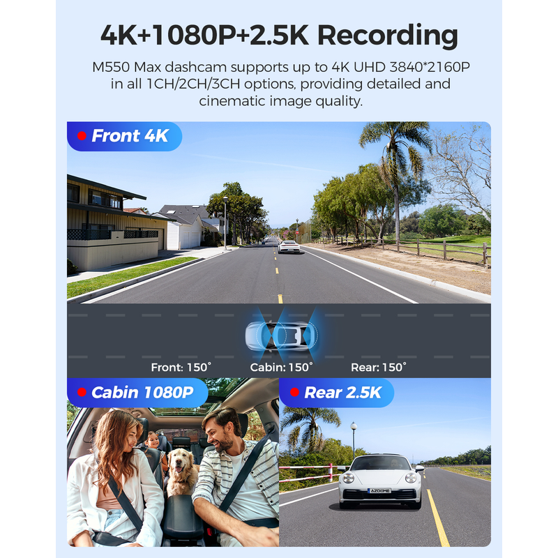 the M550 Max 4K dash cam is able to accurately capture the driver and passengers even when the cabin is completely dark and increase exposure automatically in dark situations.