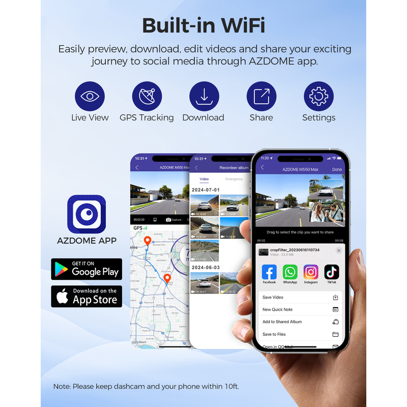 With built-in WiFi, M550 Max dashcam is compatible with AZDOME app,