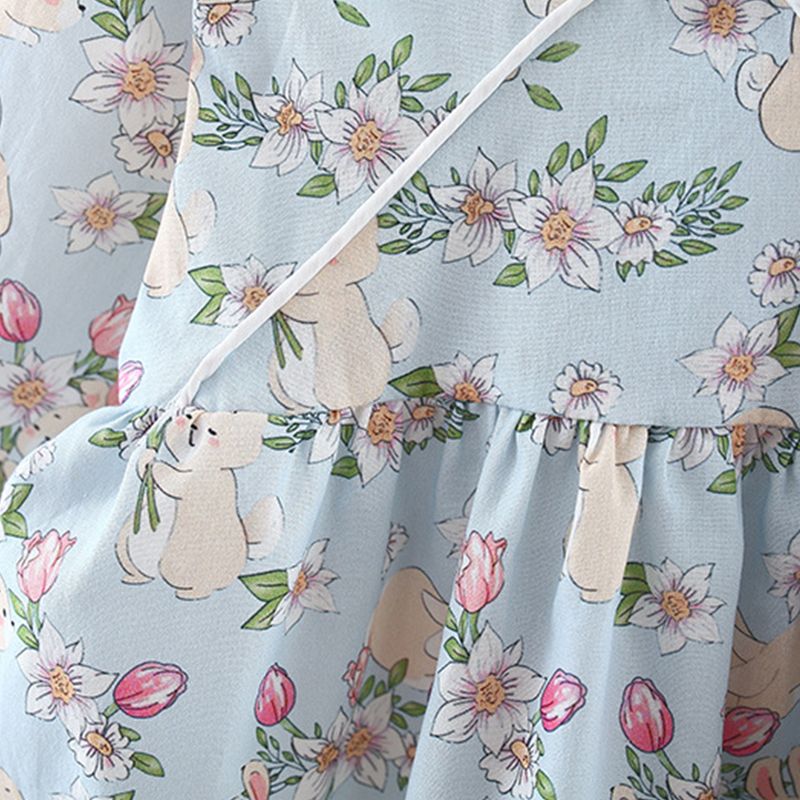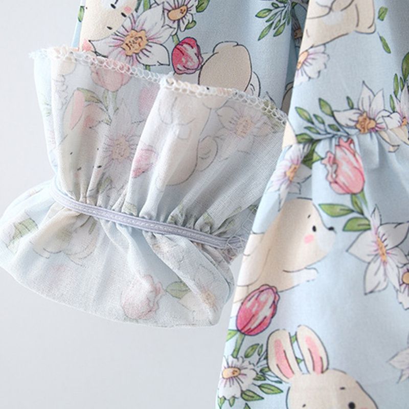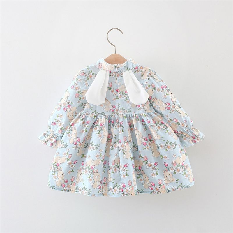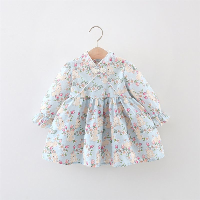 Baby Girl Chinese Style Cheongsam Cute Bunny Flower Print Long Sleeved Dress with Rabbit Ear Design Autumn Girl Outing Clothes