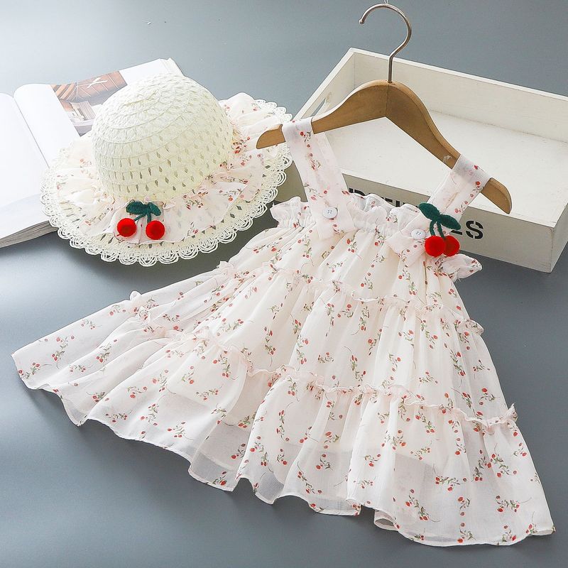 Baby Girl Dresses Summer Full Printed Floral Cherry Halter Girl Dresses Cute Cotton Multi Layer Girl Princess Dresses
