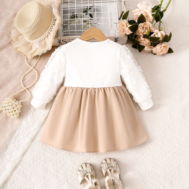 Baby Girl Light Brown Two-Piece Set with White Lace Long Sleeve Top And Overalls Patchwork Large Bowknot Autumn Fashion Dress