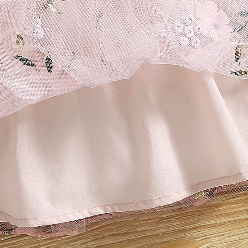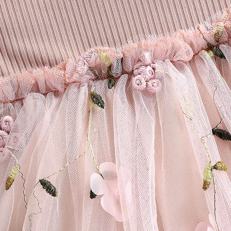 Baby Girl Pink Ribbed Long-Sleeve Bowknot Floral Embroidered Mesh Dress Perfect For Outings And Daily Wear