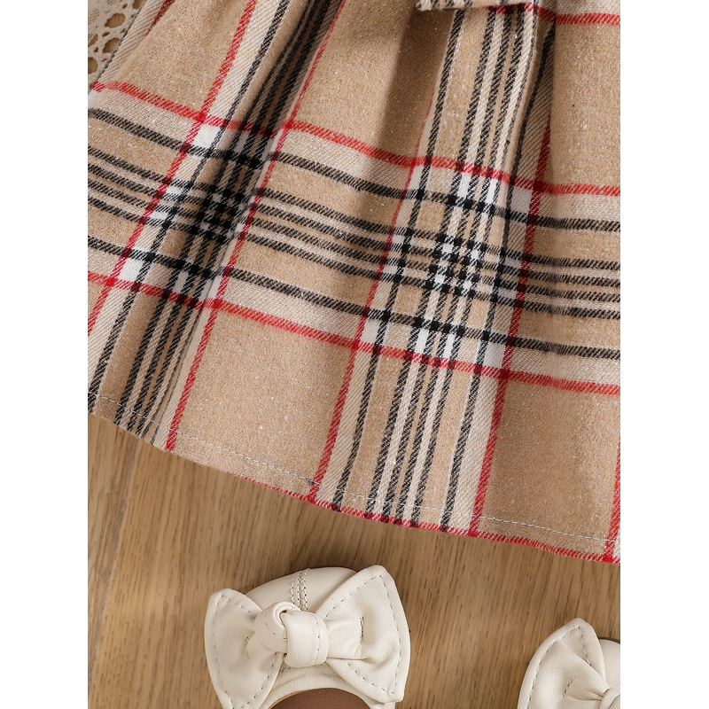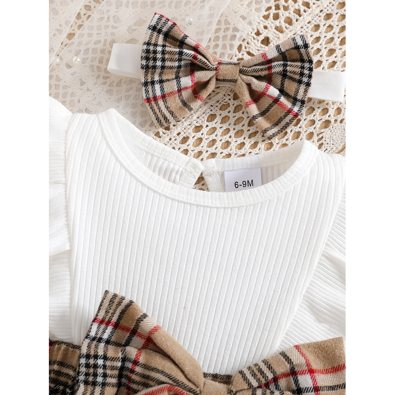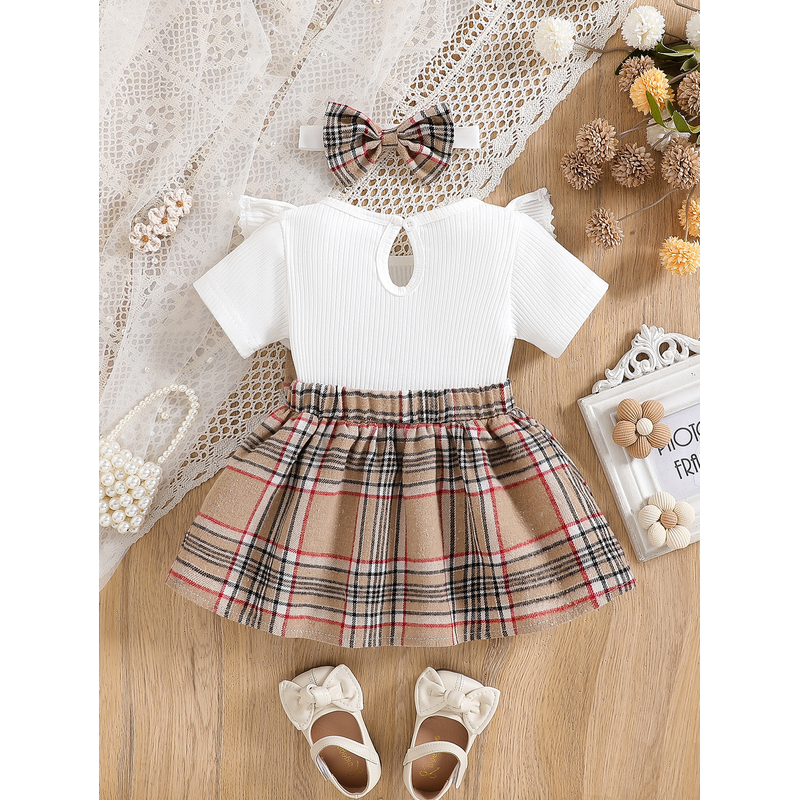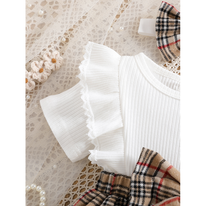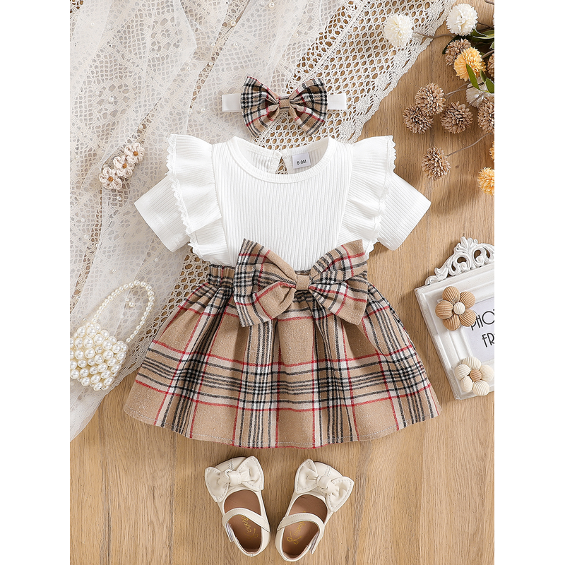 Baby Girl Summer Fashion Cute Casual Round Neck Ruffle Lace Decoration Short Sleeved Waist Large Bow Plaid Splicing Design