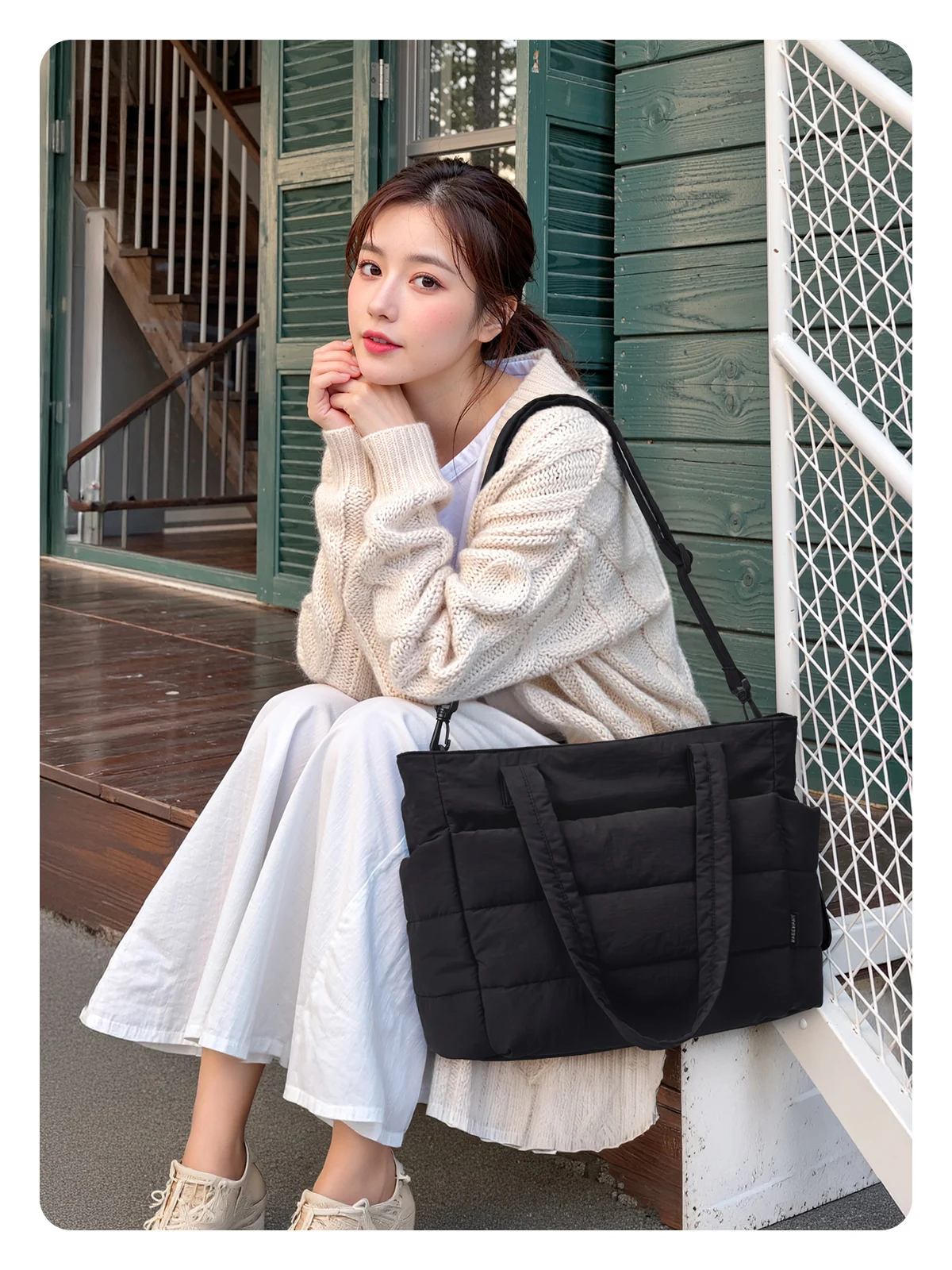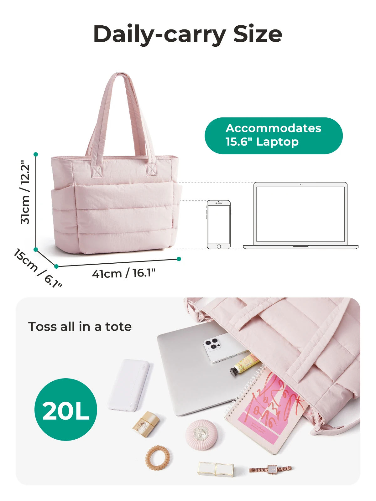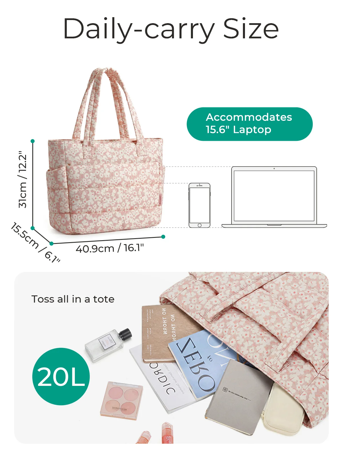 Compact Size: Size: 16.1'' x 6.1'x 12.2'', Capacity 20L. The quilted tote bag suitable daily necessities such as 15.6'' laptops, Umbrella, water cup, power banks, clothes, shoes, etc. The zipper closure design ensures the safety.