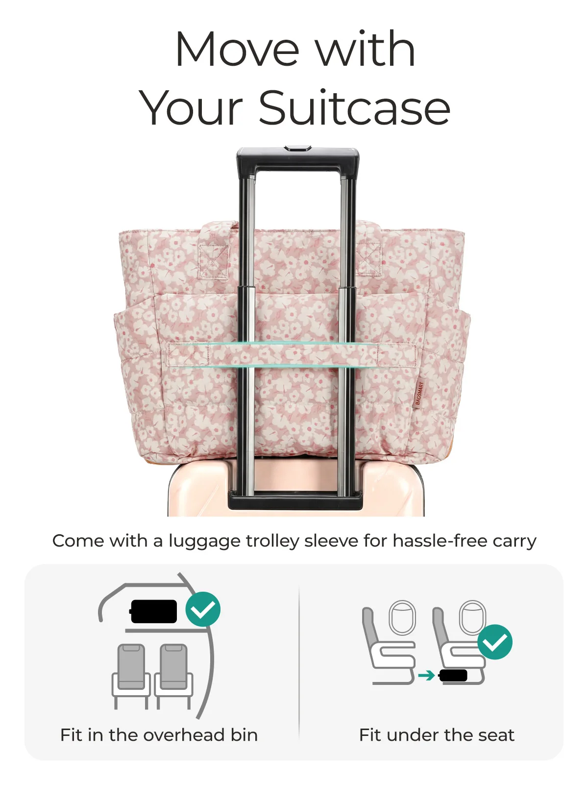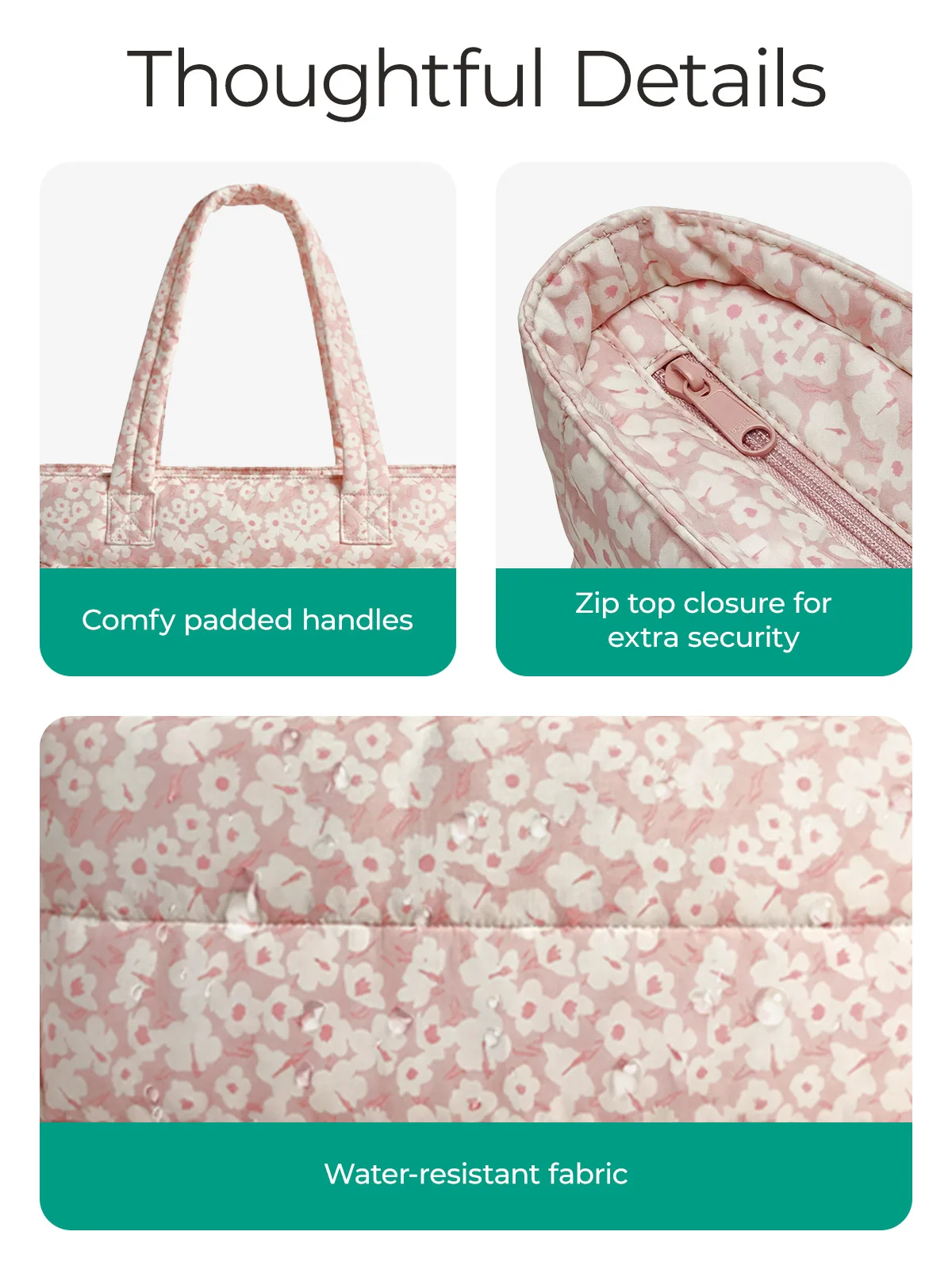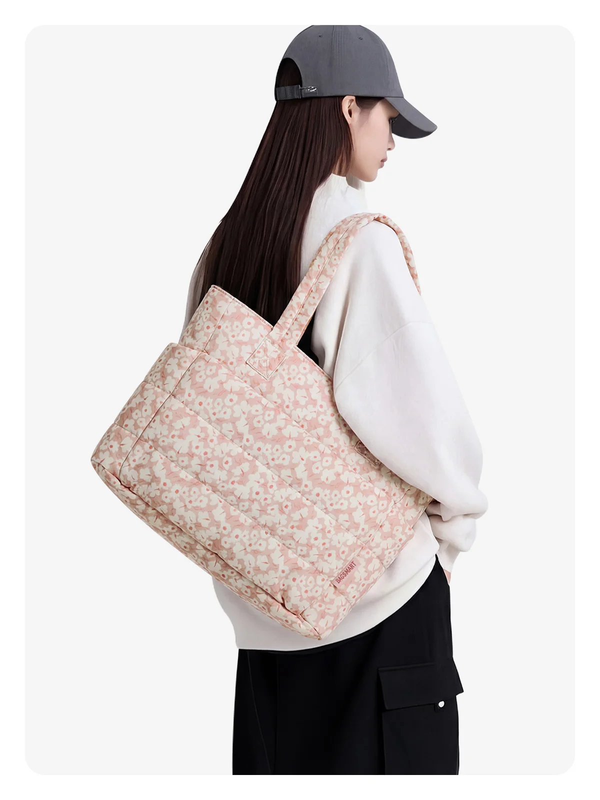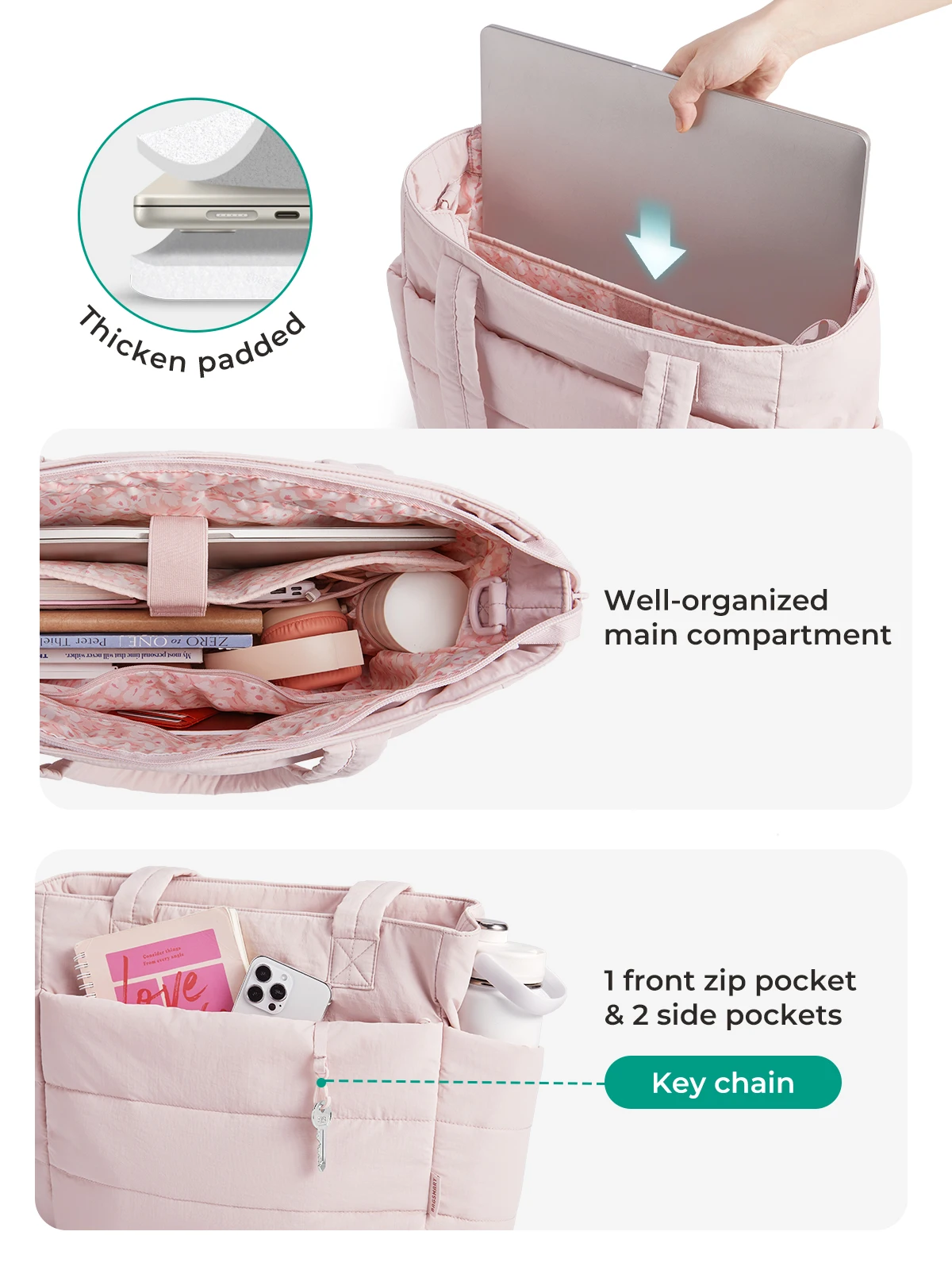 Compact Size: Size: 16.1'' x 6.1'x 12.2'', Capacity 20L. The quilted tote bag suitable daily necessities such as 15.6'' laptops, Umbrella, water cup, power banks, clothes, shoes, etc. The zipper closure design ensures the safety.