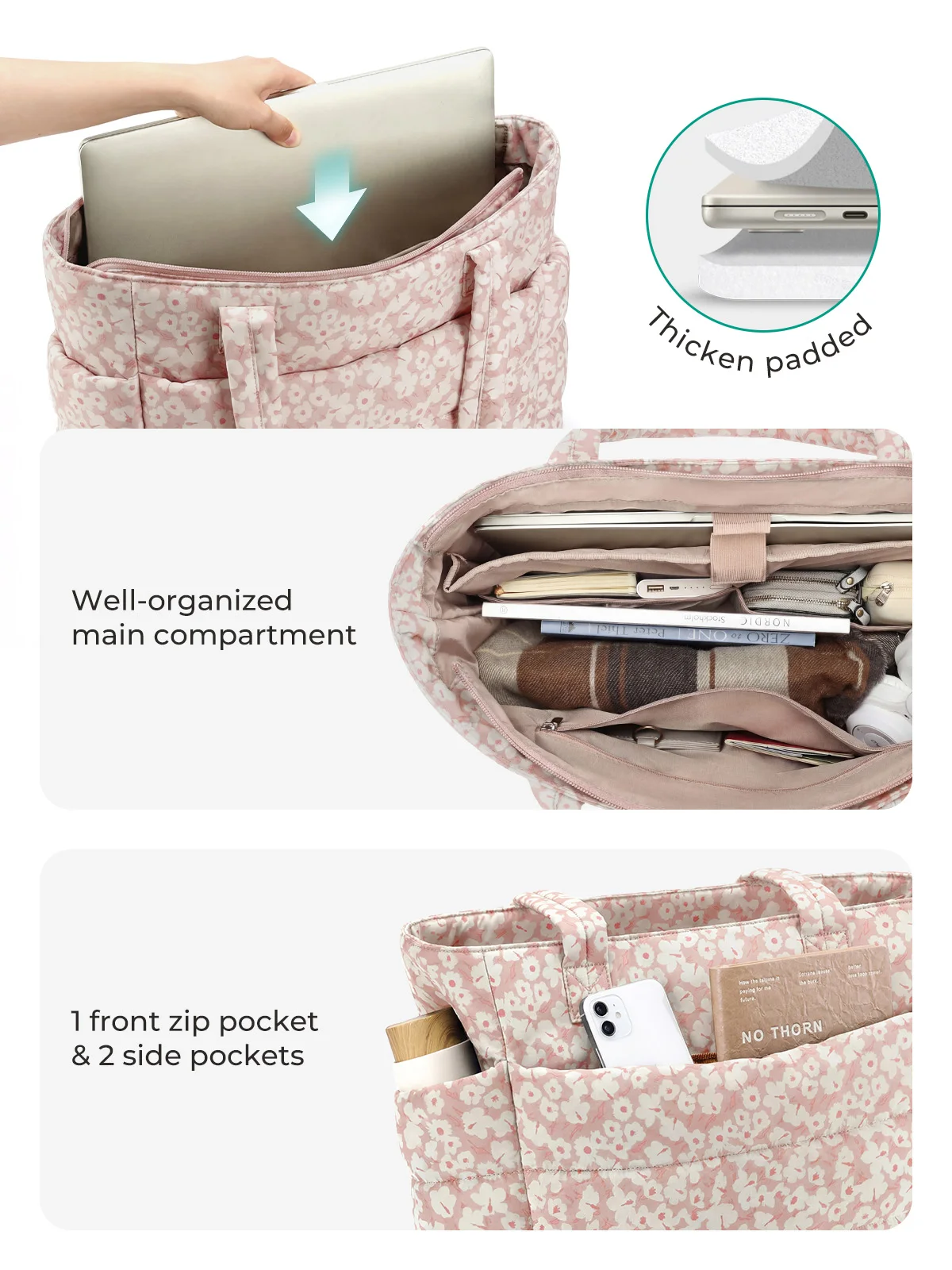 Multi-pocket: The women tote bag feasures many separate pockets. 1 multiple layer main compartment can easily hold 15.6'' laptop computer, A4 folder, clothes, etc. 2 side widen pocket + 1 front pocket allow you quick access the items you need. Refusing backpacks like turtle shells, you deserve a large and stylish tote bag.