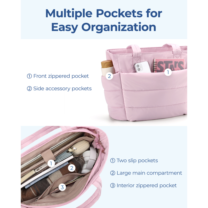 Multi-pocket: The women tote bag feasures many separate pockets. 1 multiple layer main compartment can easily hold 15.6'' laptop computer, A4 folder, clothes, etc. 2 side widen pocket + 1 front pocket allow you quick access the items you need. Refusing backpacks like turtle shells, you deserve a large and stylish tote bag.