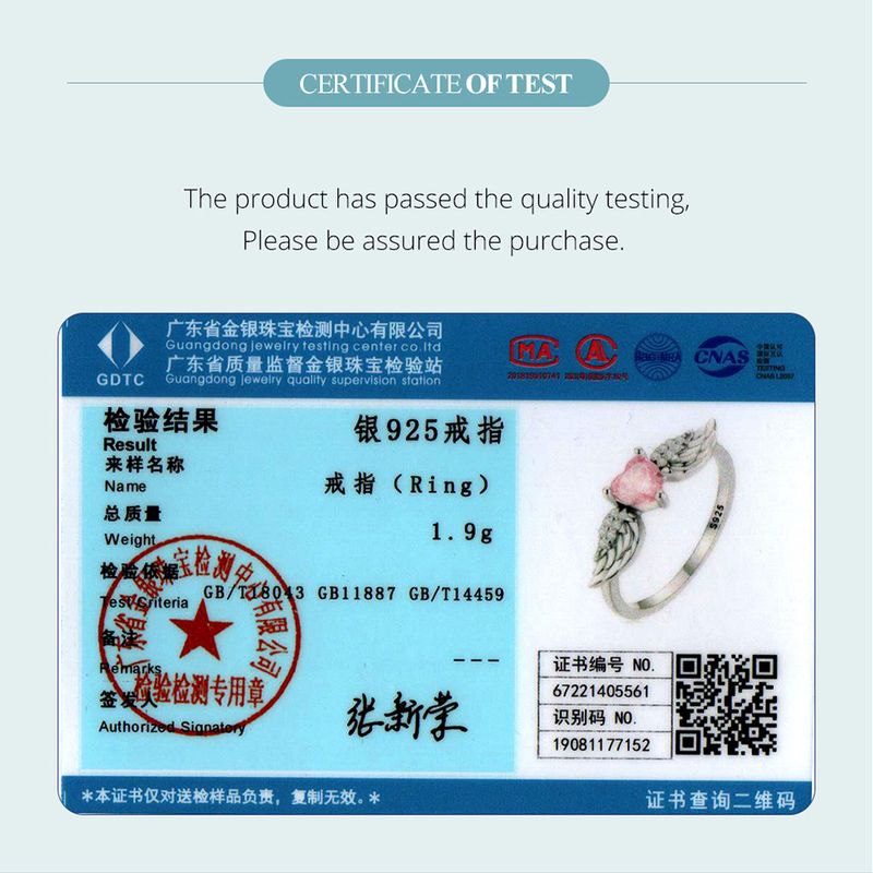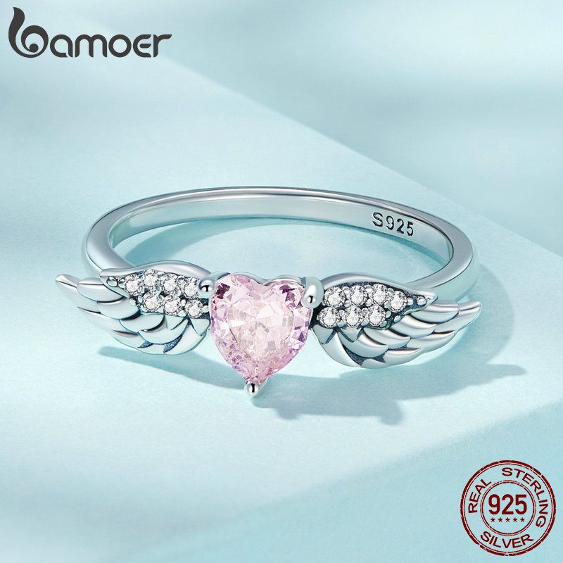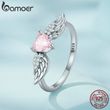 BAMOER 925 Sterling Silver Angel Wing Ring for Women Retro Feather Pink Heart Zircon Eternity Band Ring Anniversary Jewelry Gift