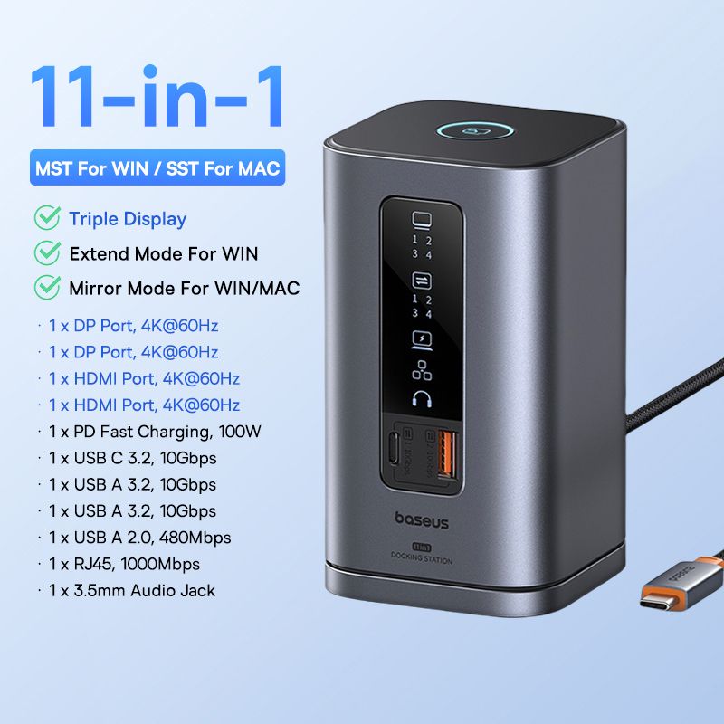 Baseus 11-IN-1 USB C HUB HDMI DP 4K@60Hz MST Triple Display USB 3.2 Splitter with RJ45 3.5mm Mic PD100W Magnetic Docking Station