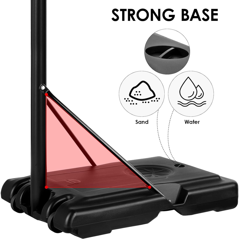怐CAN BE FILLED WITH WATER OR SAND怑The lower base can be filled with approx. 65kg of water or sand to ensure good stability and safety every time you hit the ball. Note: Before you assemble the bracket, please spray some water or sand into the base to ensure that the basketball stand does not tip over or fall down.