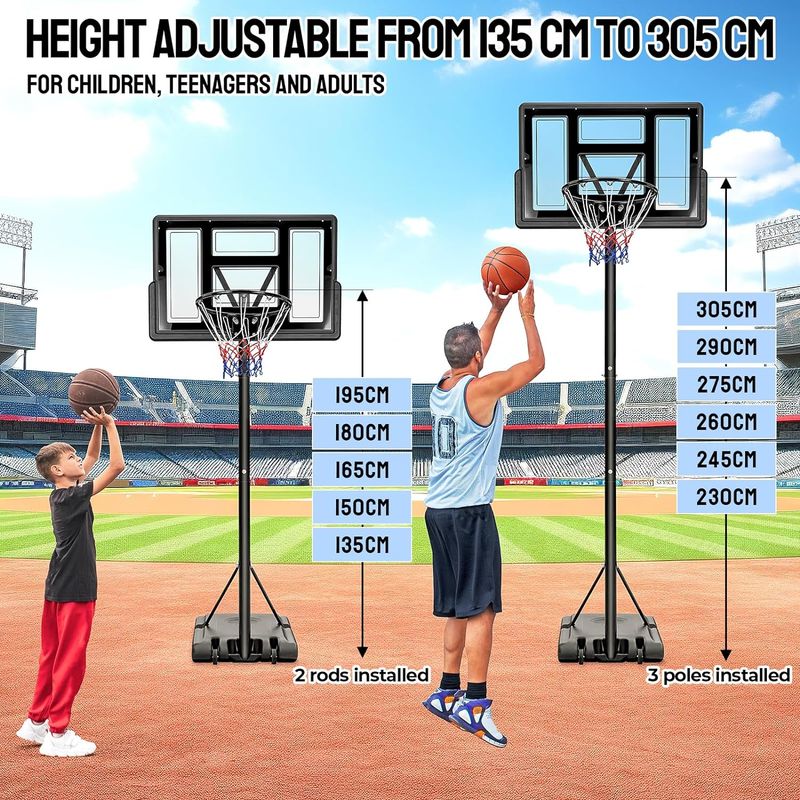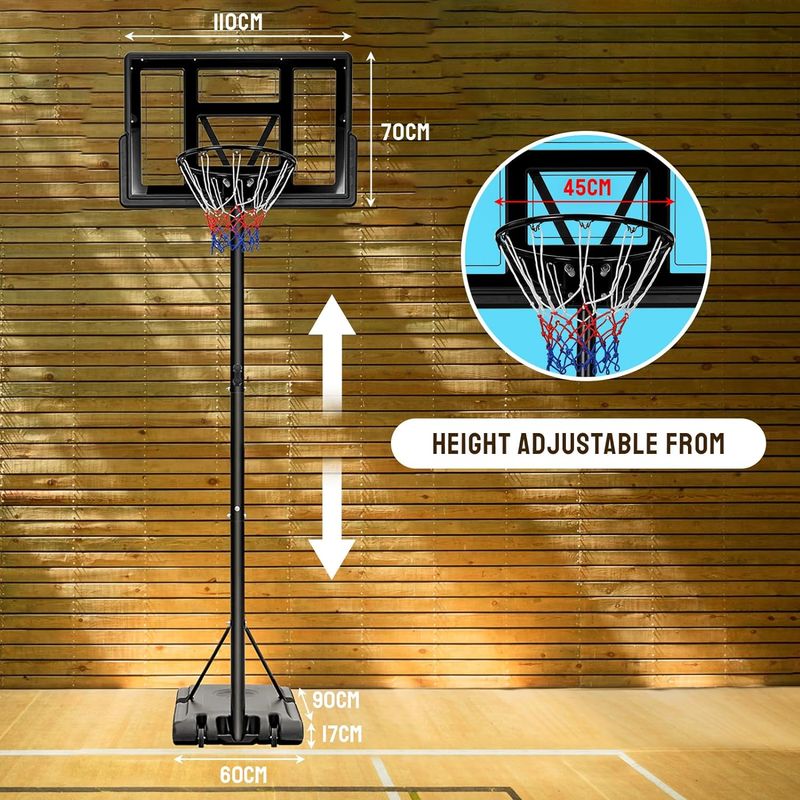 怐SIZE AND HEIGHT ADJUSTABLE怑The basketball board size is 110 x 70 cm, basketball stand base size is 90 x 60x 15 cm and basket diameter is 45cm. You can adjust the height of the basket from 230 cm to 305 cm. Our basketball hoop uses a standard size design so that all age groups can enjoy the game. Basketball dream, start with our basketball hoop system.