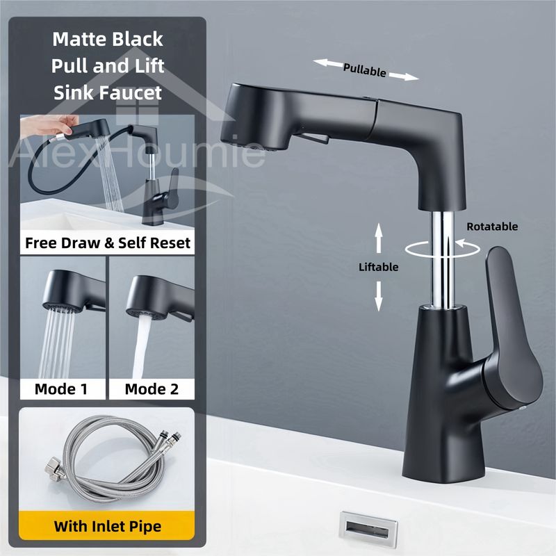 The bathroom faucets with two sprinkler modes have pull and lift functions, meeting the needs of a variety of people. The faucet head- can be pulled- out and has an extension hose-, which makes it easier- for users to clean the sink or meet other needs-.