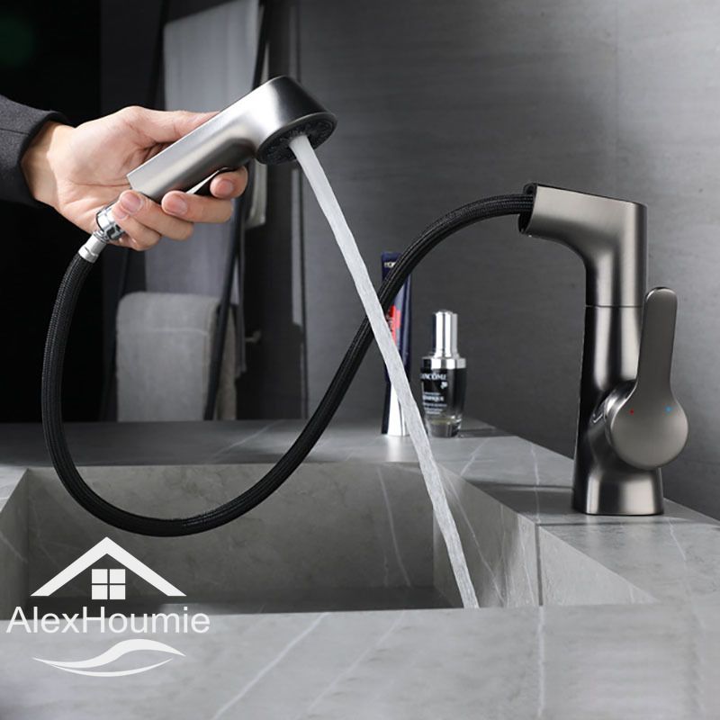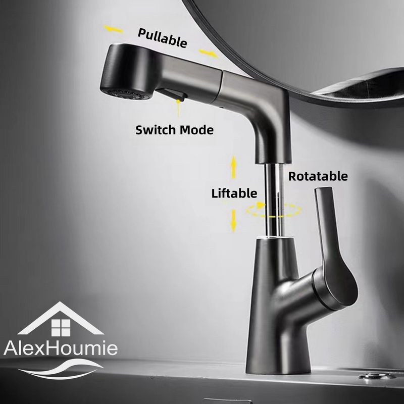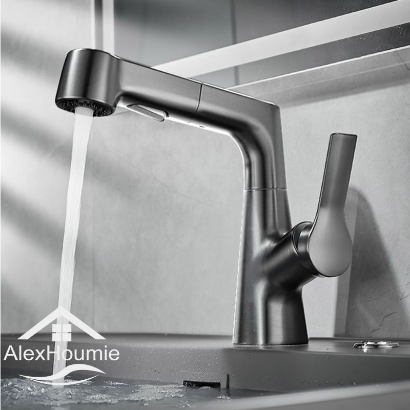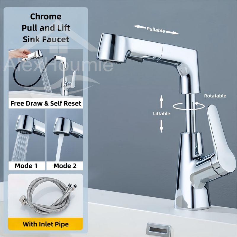 The bathroom faucets with two sprinkler modes have pull and lift functions, meeting the needs of a variety of people. The faucet head- can be pulled- out and has an extension hose-, which makes it easier- for users to clean the sink or meet other needs-.