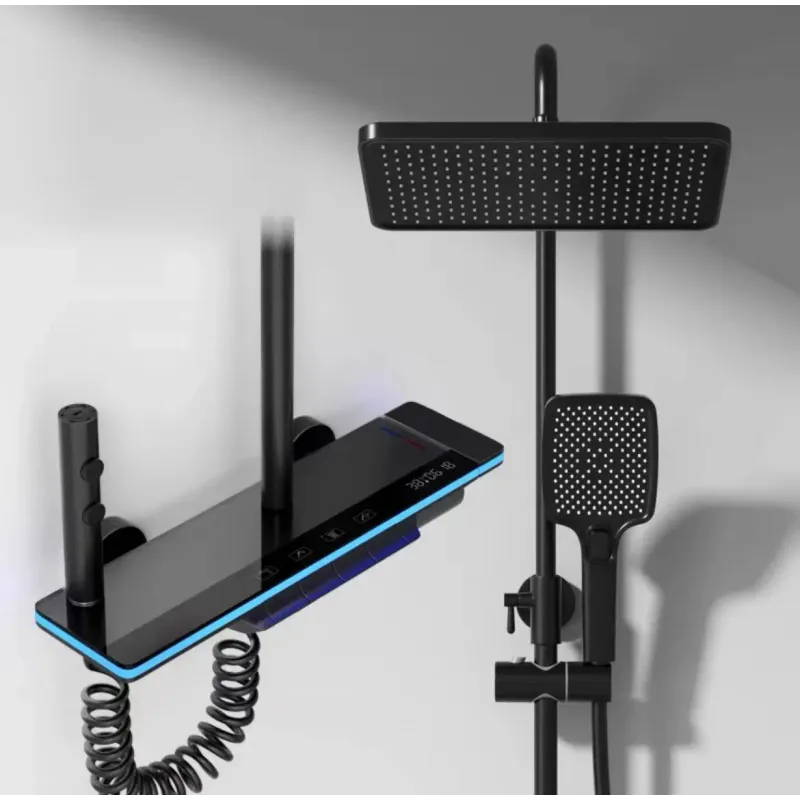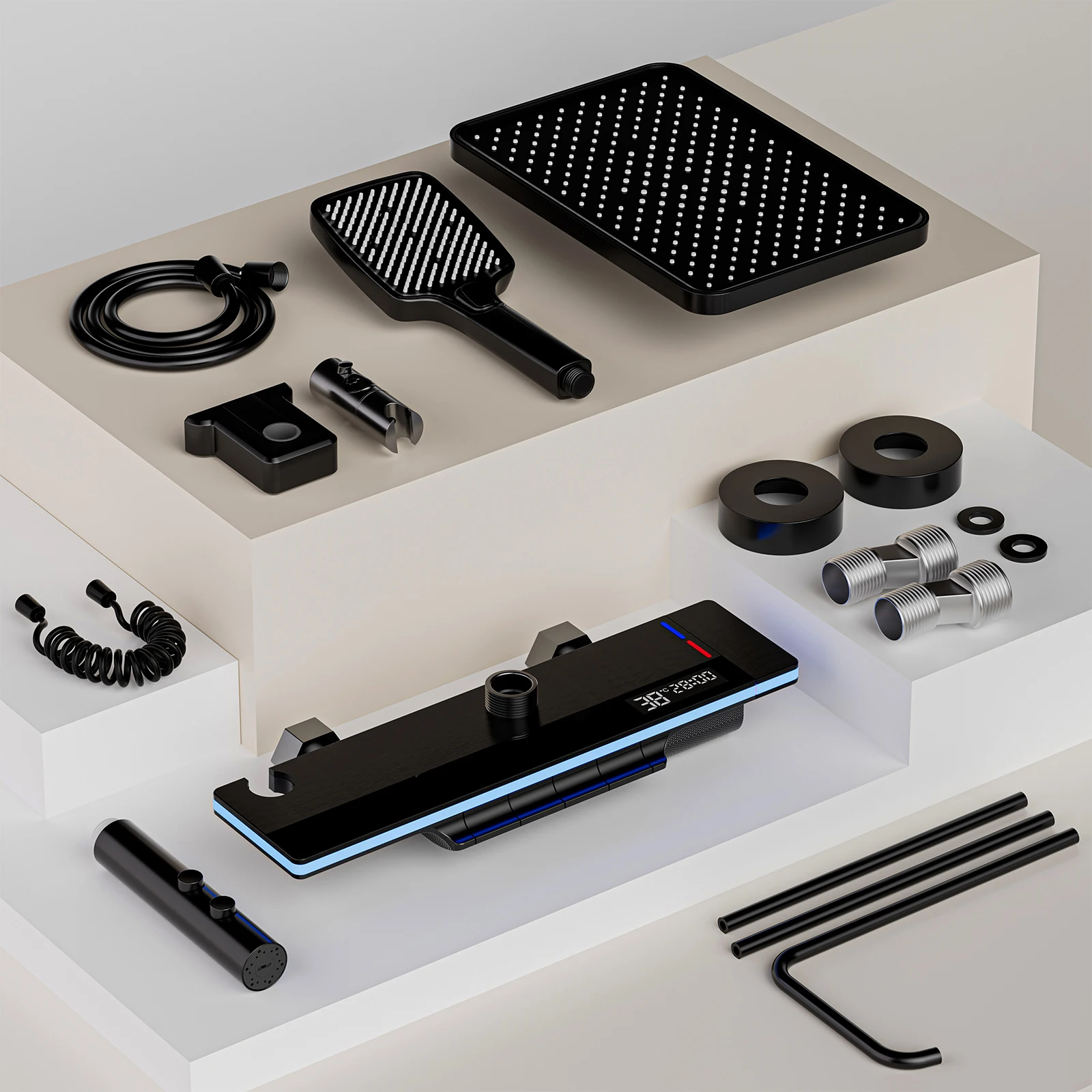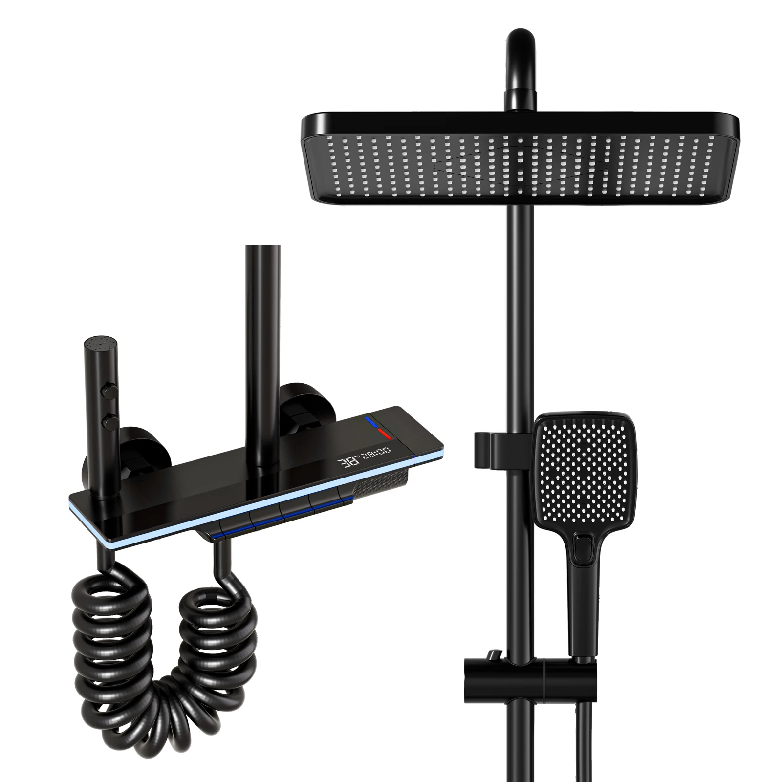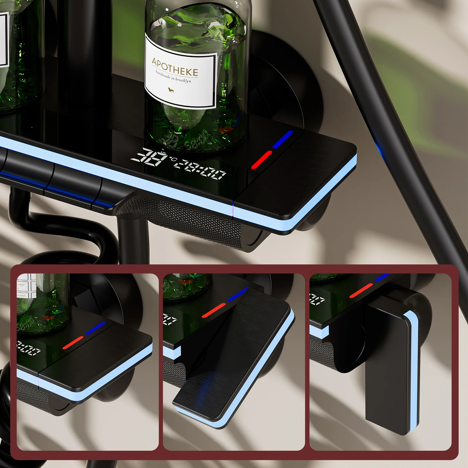 Bathroom Luxury Shower Faucet System with Lights Tempered Glass Shower Set Digital Display Copper Mixer Shower Faucet Set