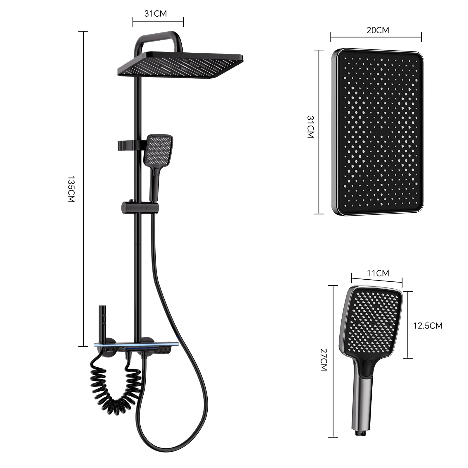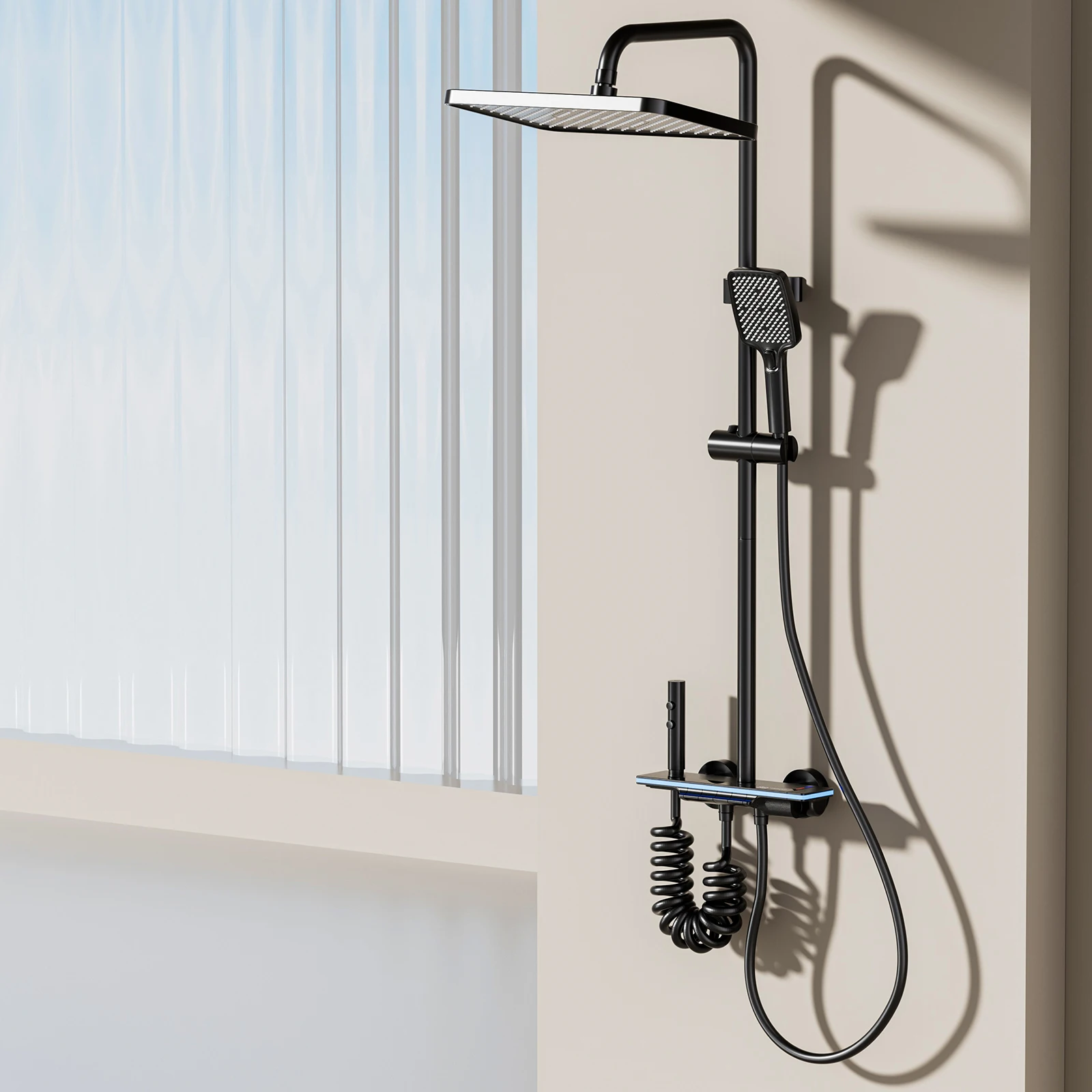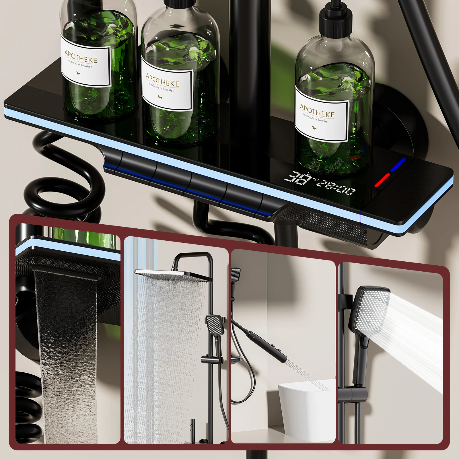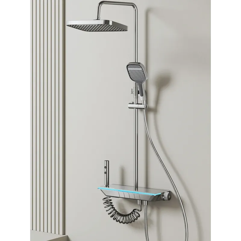 Bathroom Luxury Shower Faucet System with Lights Tempered Glass Shower Set Digital Display Copper Mixer Shower Faucet Set