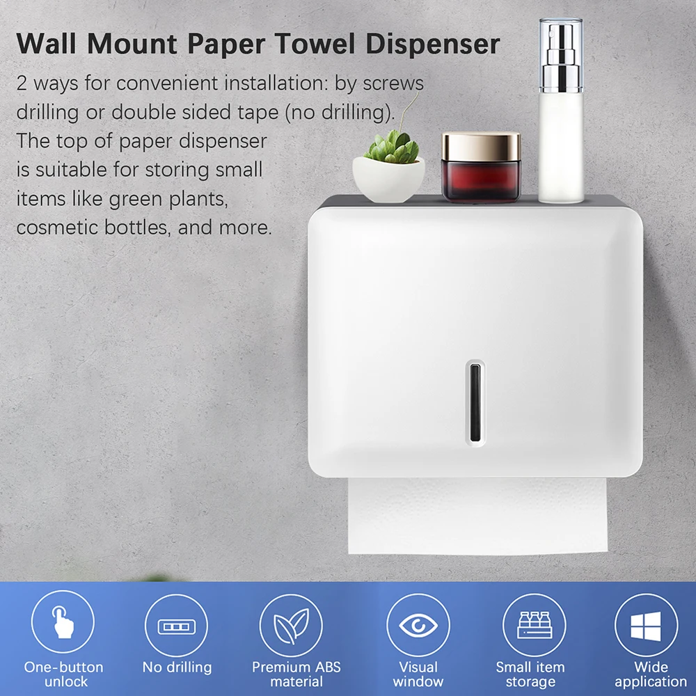[Easy to Install] Wall-mount paper towel dispenser offers 2 ways for convenient installation: by screws drilling or double-sided sticky mat (no drilling).