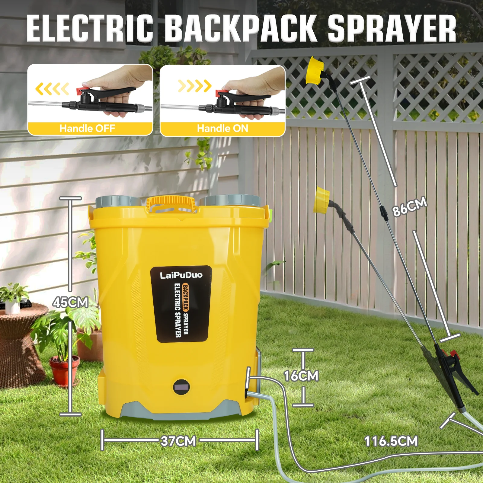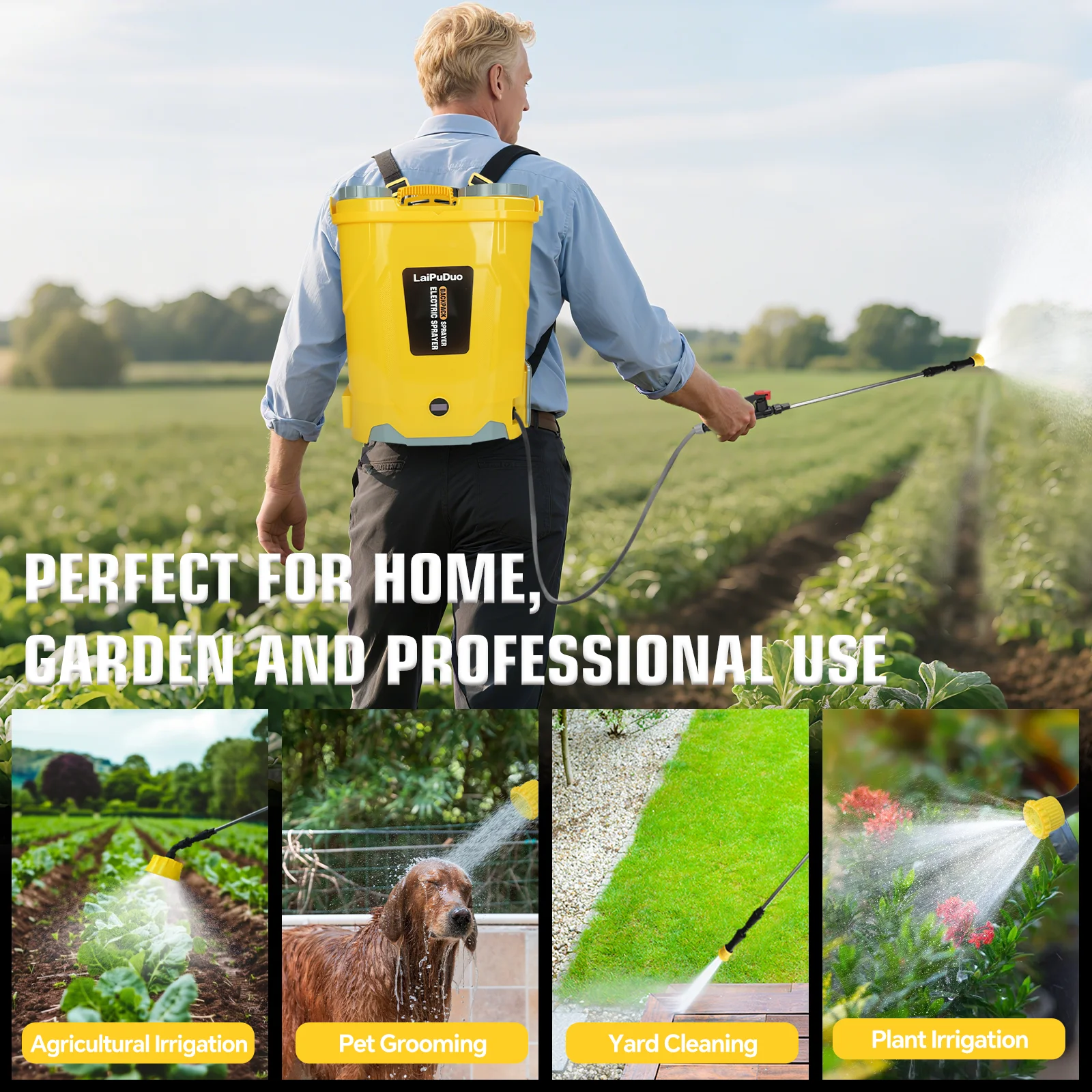 【Wide Application】The LaiPuDuo electric garden sprayer has 4 different nozzles and can handle various tasks, including weed and feed lawn fertilizers, spraying fertilizers or herbicides, cleaning cars, bathing pets, sprinklers in the yard, and so on.