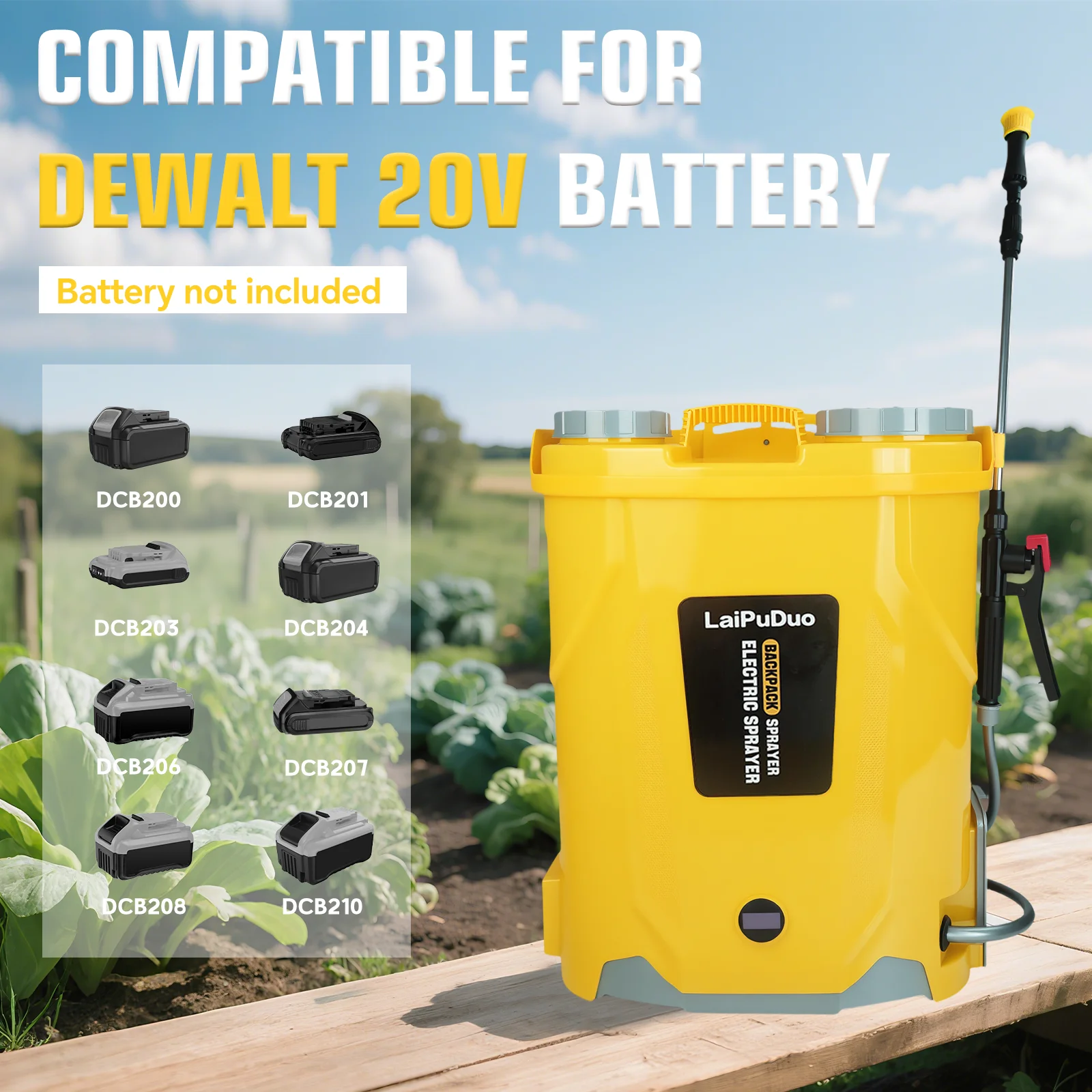 【Compatible with Dewalt 20V Battery】Our LaiPuDuo backpack sprayer is compatible with Dewalt 20V max batteries DCB206 DCB205 DCB204 DCB181 DCB182 DCB200 DCB203 DCB205-2 DCB204-2 DCB206-2 and more. (Only tool, battery not included)