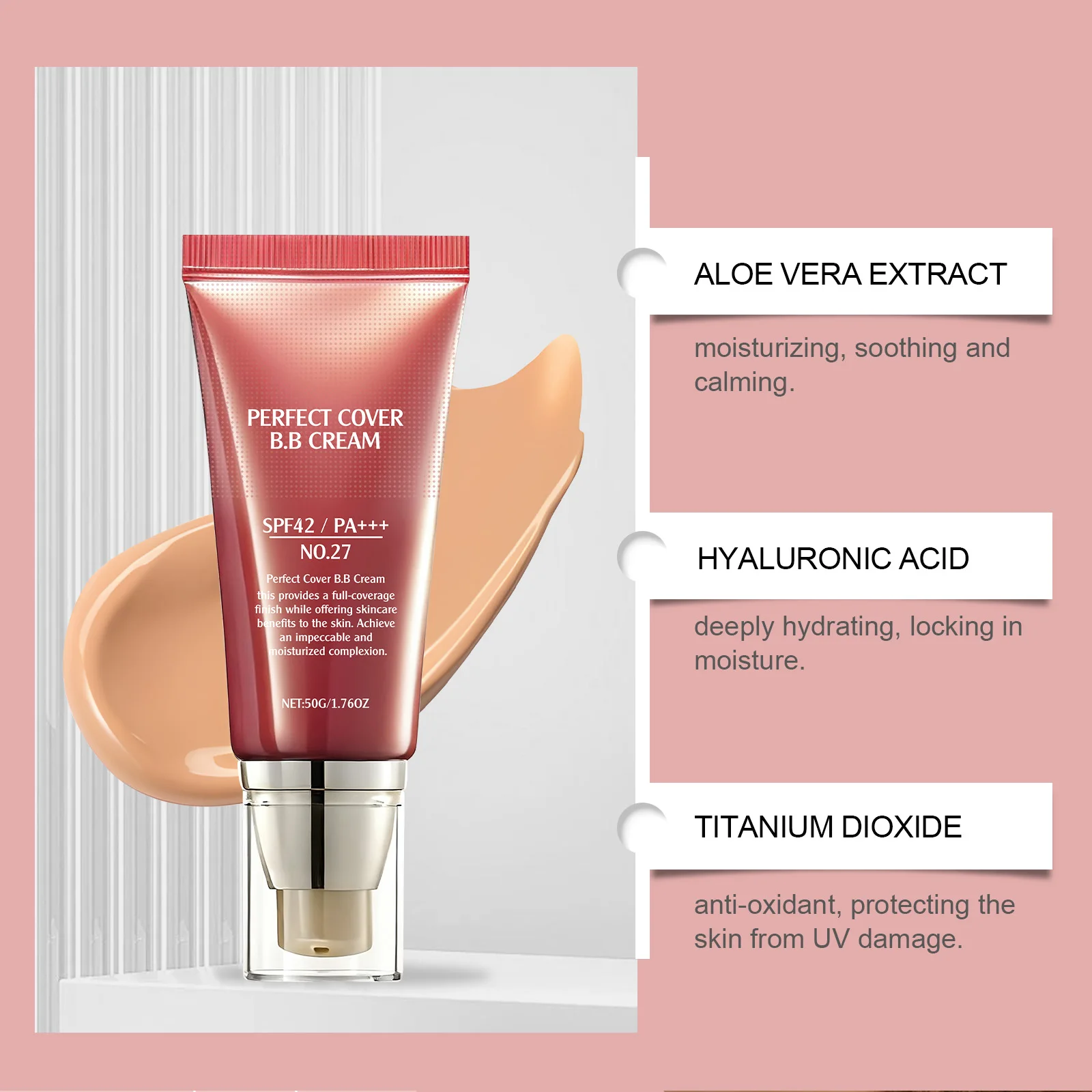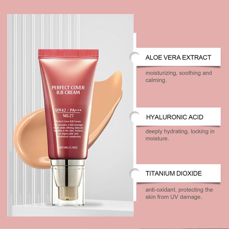 BB Cream SPF 42 PA +++ Tinted Moisturizer for Face Full Coverage Concealer Liquid Foundation Makeup for Dark Circles Fine Lines 50G