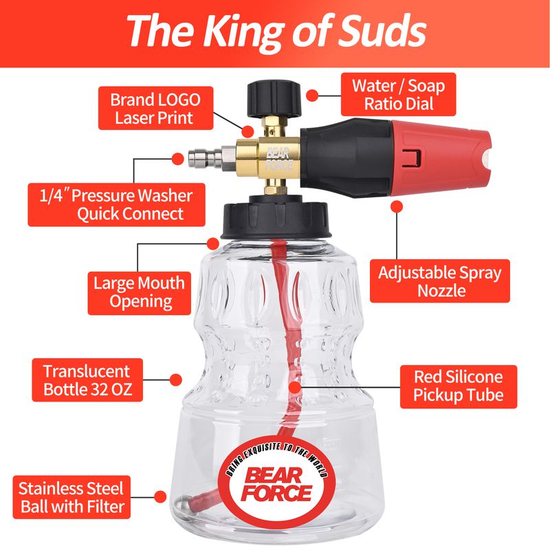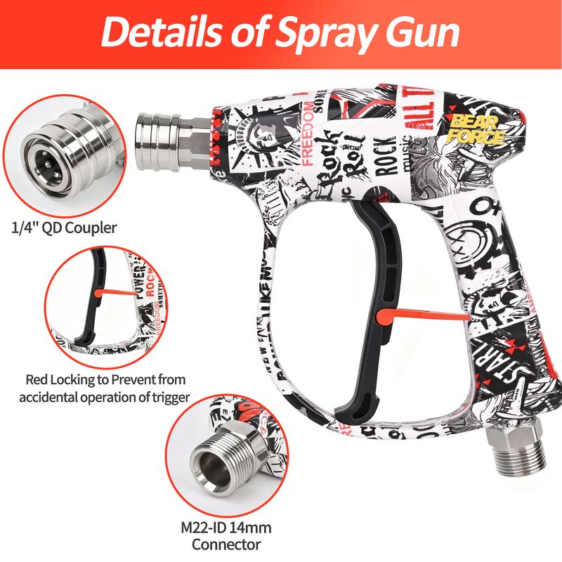 BEAR FORCE Pressure Washer Color Painted Short Spray Gun Kit features trendy North American-style graphics, a durable PP+glass fiber shell equipped with brass valve and stainless steel connectors, 210bar/ 3000Psi max pressure, leak-proof design, built-in safety lock, and 1/4" quick connector .The package comes with 5 color nozzles: 0°, 15°, 25°, 40° and soap spray mode.