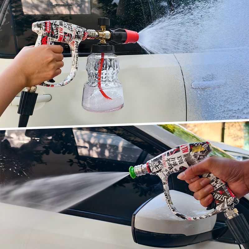 【Special Design】There is a safety locking buckle at the trigger of the washer gun. When not in use, you can pull the buckle to lock the spray gun to prevent accidental spraying. In addition, the spray gun housing is painted with classic North American cultural elements, boasting a trendy design that catches the eye instantly.