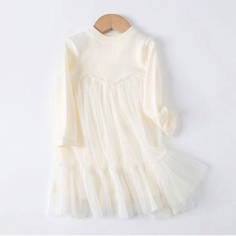 Bear Leader Girls' Dress 2025 Autumn New Girls' Round Neck Knitted Long Sleeve Mesh Splice Dress Children's Fashion Clothing