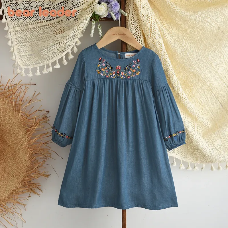 Bear Leader Korean Version Long Sleeve Blue Girls Casual Dresses Autumn Imitation Denim Flower Embroidery Dress Kids Clothes
