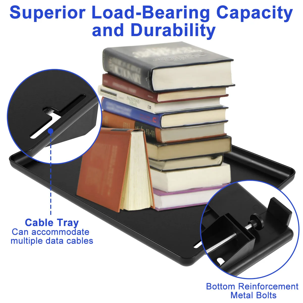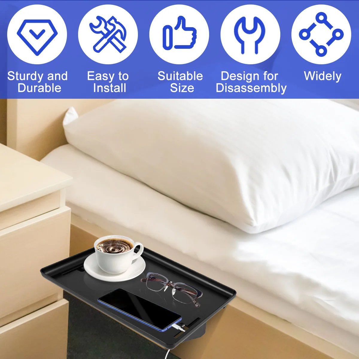 [High Quality Material] This bedside shelf tray is made of high quality ABS and metal (with reinforcement bolts on the bottom) material, excellent load bearing capacity, not easy to deform or wear out, and long-lasting.