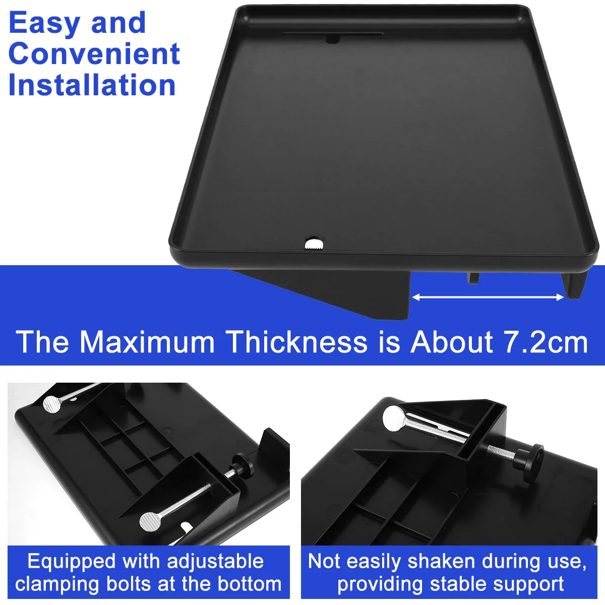[Easy to Install] This bedside shelf tray is equipped with a bolt at the bottom that can adjust the tightness of the clamping, the maximum thickness that can clamp is about 7.2cm, and the bolt is reinforced for installation, which makes the tray not easy to shake when in use, and provides a solid support.