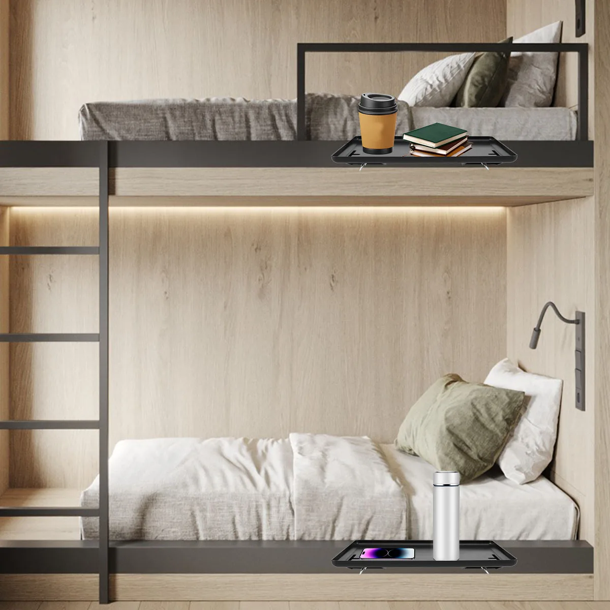 [Detachable & Pure Color] This detachable bedside tray can be used as a bunk bed shelf or dormitory bed shelf, and it is easy to use and can be easily disassembled when not in use. Its black/white appearance can match different home styles.