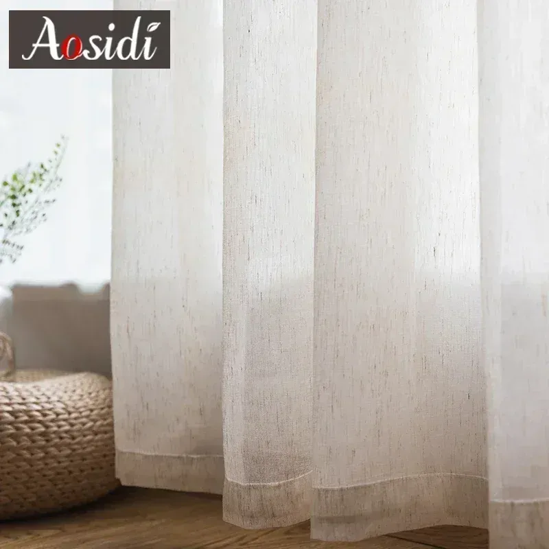Beige linen look tulle curtains for living room Modern flax sheer curtains for bedroom Solid voile cortina for kids window drape