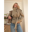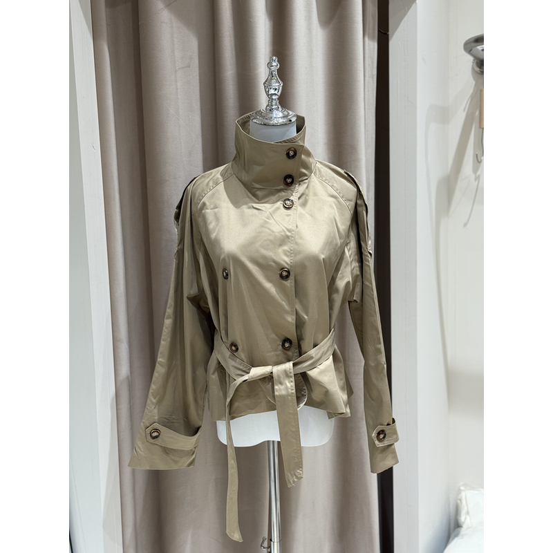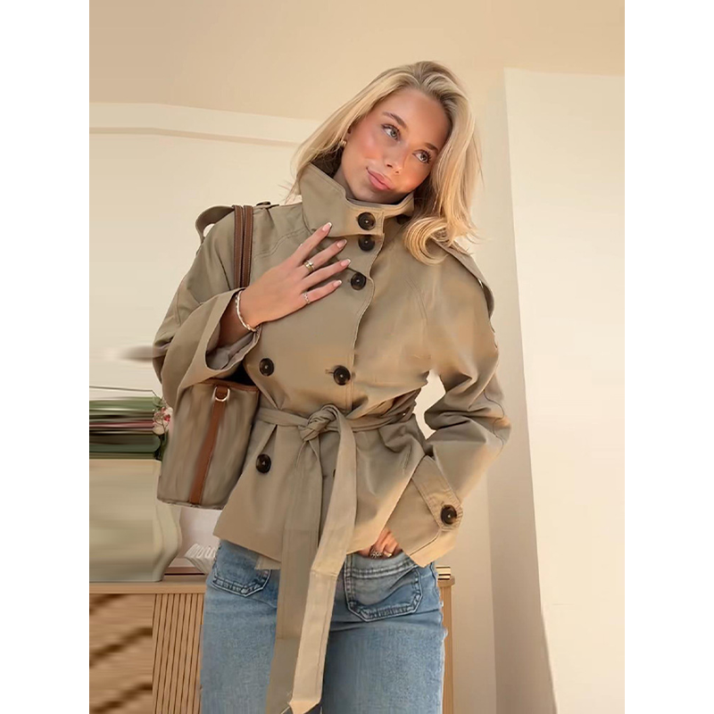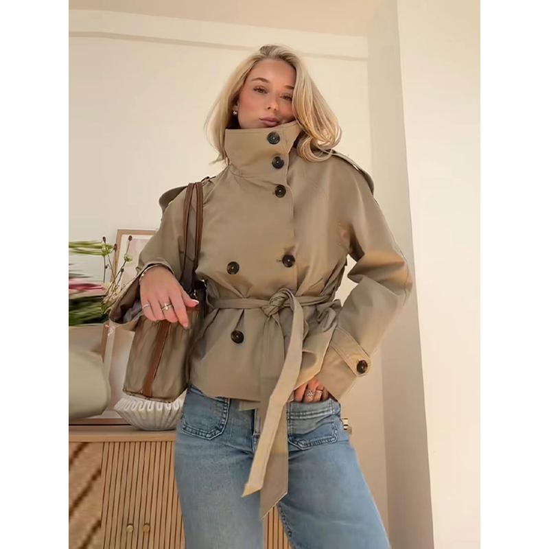 Belted Waist Cropped Trench Jackets Women Double Breasted Stand Collar Coats 2025 Autumn Chic Casual Vintage Jacket Women Cloth