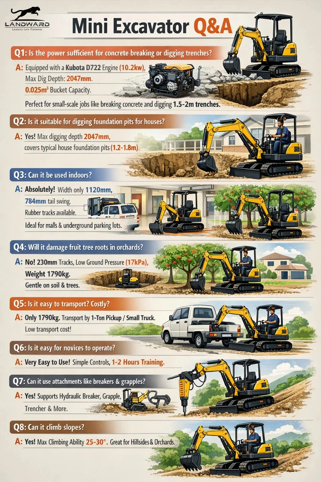 Landward have mini excavators from 1ton-8tons, if need other model which not showed here, please click and find our professional salesman for more information and the best price.