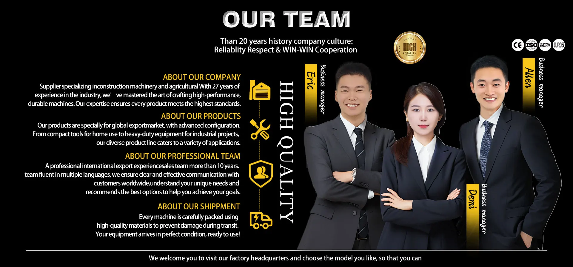 In 2018, we engaged in small machine, like small excavators, mini dumpers, mini wood chippers at the time when the Euro market begin to accept Chinese mini machine.