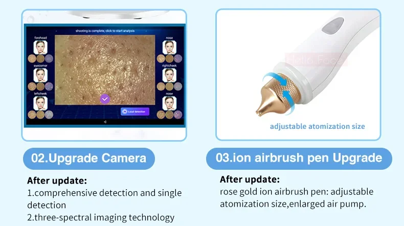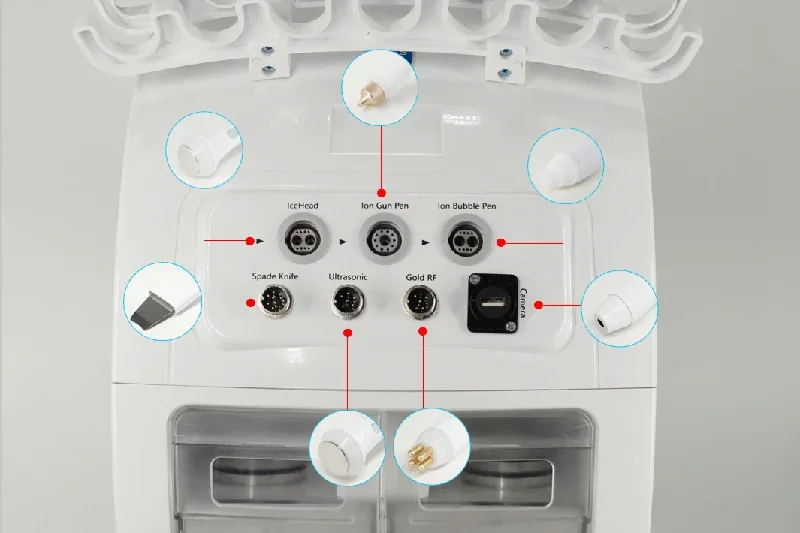 and adapts cosmetic care programs based on diagnostic results.And intelligently recommend professional skin care products;six high-profile cosmetic functions combined with "spatula", "ionic bubble pen", "ionic airbrush", "ultrasonic", "gold radio frequency", "ice head" and other technologies, comprehensive skin management combined with AI skin test diagnostic results, targeted matching of skin care products and other skin care items, to develop a multifunctional skin test instrument and integrated skin care device.