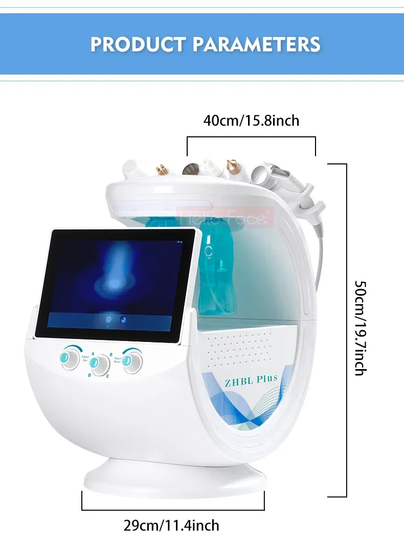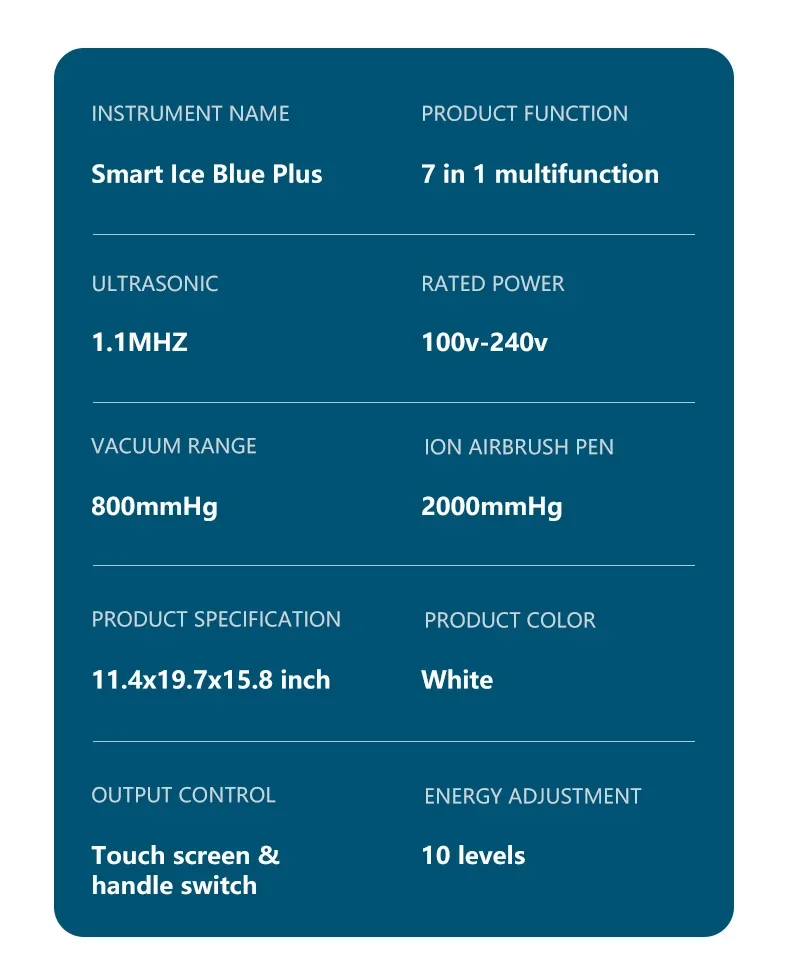 Material: Durable metal constructions with water and air cooling Screen: 10.1 inch touchscreen and practical switch on the handle Multi-functionality: 7 integrator functions for comprehensive skin management Advanced technology: AI for skin diagnosis using triple optical beam User comfort: Lightweight design weighing 12 kg with the option to customize for different scenarios Customization: Possibility to personalize the screen logo and adapt to local socket standard | Smart Ice Blue 7 In 1 | Smart Ice Blue 7 | nn**Optimization of skin care** n The new generation Smart Ice Blue Plus 2.0 with 7 functions in one offers comprehensive and customized skin care. Thanks to advanced intelligent skin diagnostic technology, the device can detect problems in 8 dimensions, allowing for precise adjustment of the skincare program. Additionally, integrated functions such as hydrodermabrasion or ultrasonic skin cleansing provide intensive care regardless of skin type, from dull to matte. n n **High performance and comfort of use** n Smart Ice Blue Plus 2.0 is equipped with a clear 10.1-inch touch screen and a switch on the handle, which makes it easy to use and customize according to individual needs. Durable constructions with water and air cooling guarantee long-lasting and safe use. Lightweight construction weighing 12 kg and the ability to adapt to local standards of sockets allows for easy portability and adaptation to various environments, from the living room to the home. n n **Personalization and support after purchase** n Smart Ice Blue Plus 2.0 offers the possibility of personalizing the screen with a logo and adapting it to the customer's preferences. Offers post-purchase support, including video and online technical support, ensuring peace of mind for the customer. The device is ideal for those looking for a professional skin care solution that adapts to their individual needs and skin type.