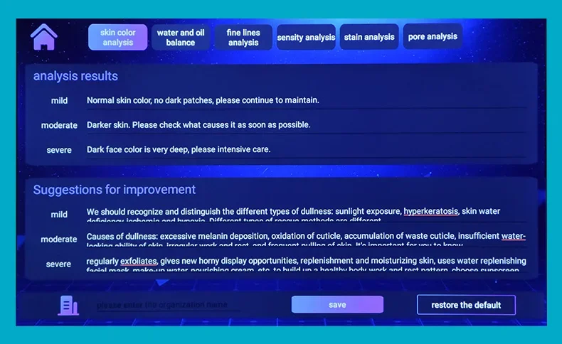 Complex analysis interface: skin color analysis, water and oil balance, fine line analysis, inflammatory condition analysis, spot analysis, pore analysis.