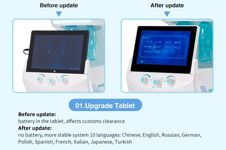 1.7 in 1 Facial Hydrodermabrasion Tablet System has been upgraded.The tablet does not have a battery to solve the customs clearance issue, solve the undetected camera issue, and the tablet can be used after turning it on, and the interface operation is simplified.